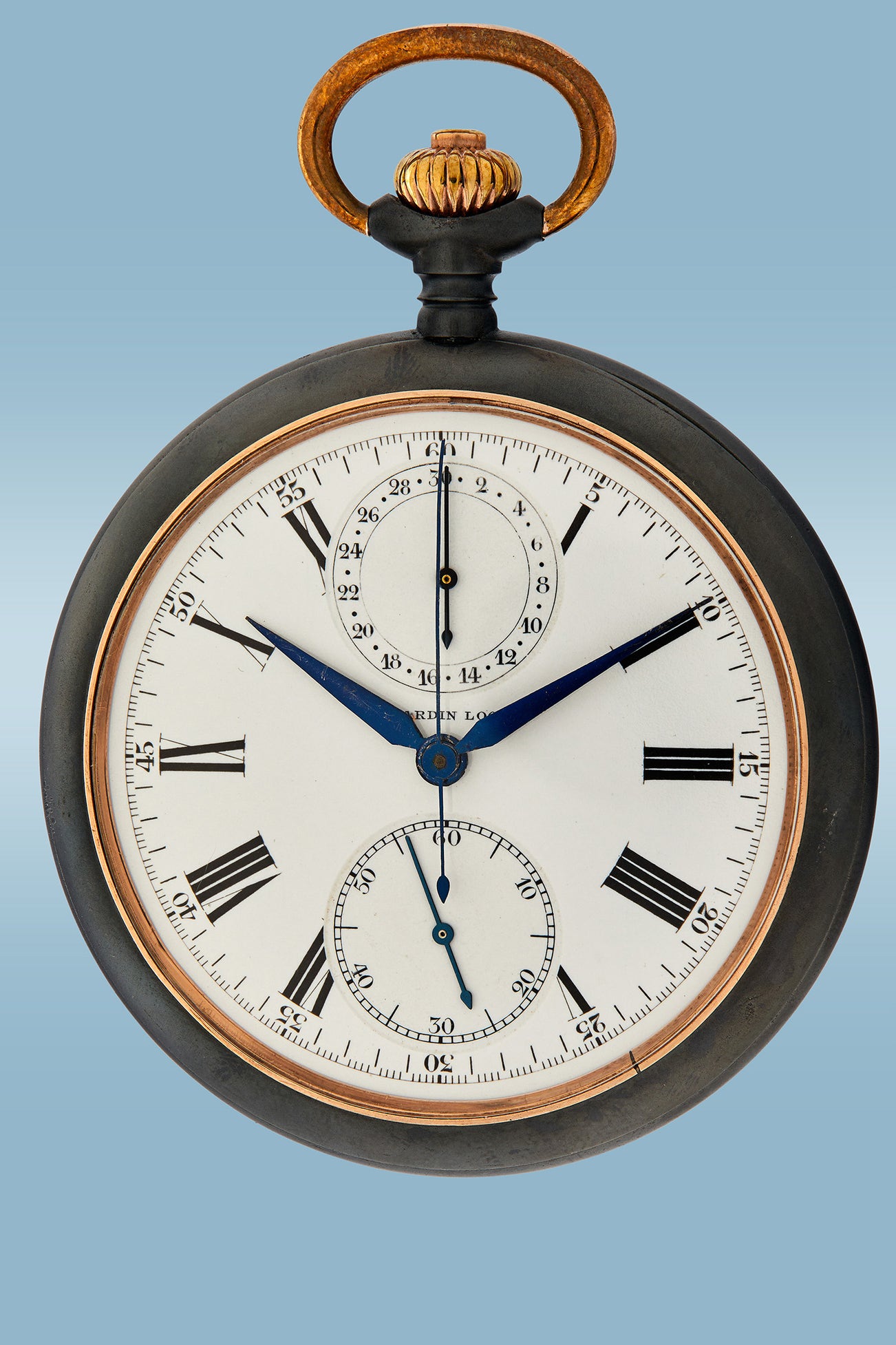 The present chronograph pocket watch is a wonderful example of Ulysse Nardin’s long history with innovative technical handcrafted movements. Long before the wristwatch, the pocket watch was both a timekeeper and tool watch used for precision timing in sports and the sciences. The current movement features a caliber 19’’’monopusher column wheel chronograph invented by Paul-David Nardin (1855-1920) and issued patent 54714 on January 21, 1911. This invention eliminated the uncontrolled leap of the chronograph wheel, which created errors that were difficult to detect. The vertical layout makes the dial easier to read, and it is a configuration used by other brands today. The gunmetal blue steel case with gold accents is corrosion-resistant, and another indication of its use as a tool watch for outdoor and indoor use.
