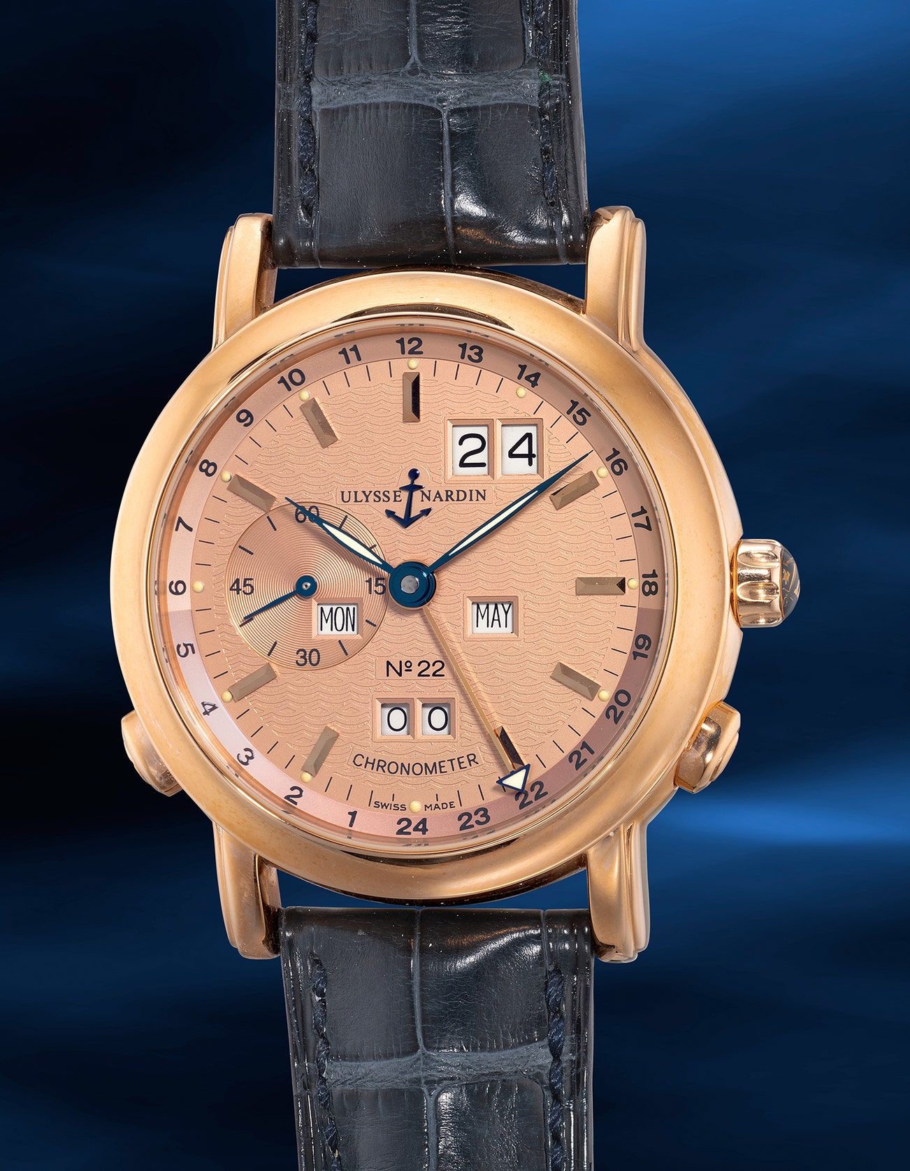 A “new-old-stock” limited edition pink gold perpetual calendar dual-time wristwatch with pink dial, certificate and presentation box, numbered 22 of a limited edition of 500 pieces