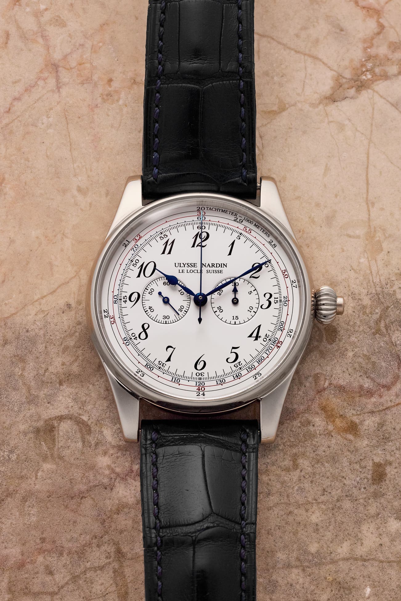 • With vintage aesthetics and dimensions, the 37mm white gold Ulysse Nardin 380-88 is a small but mighty single-button chronograph.