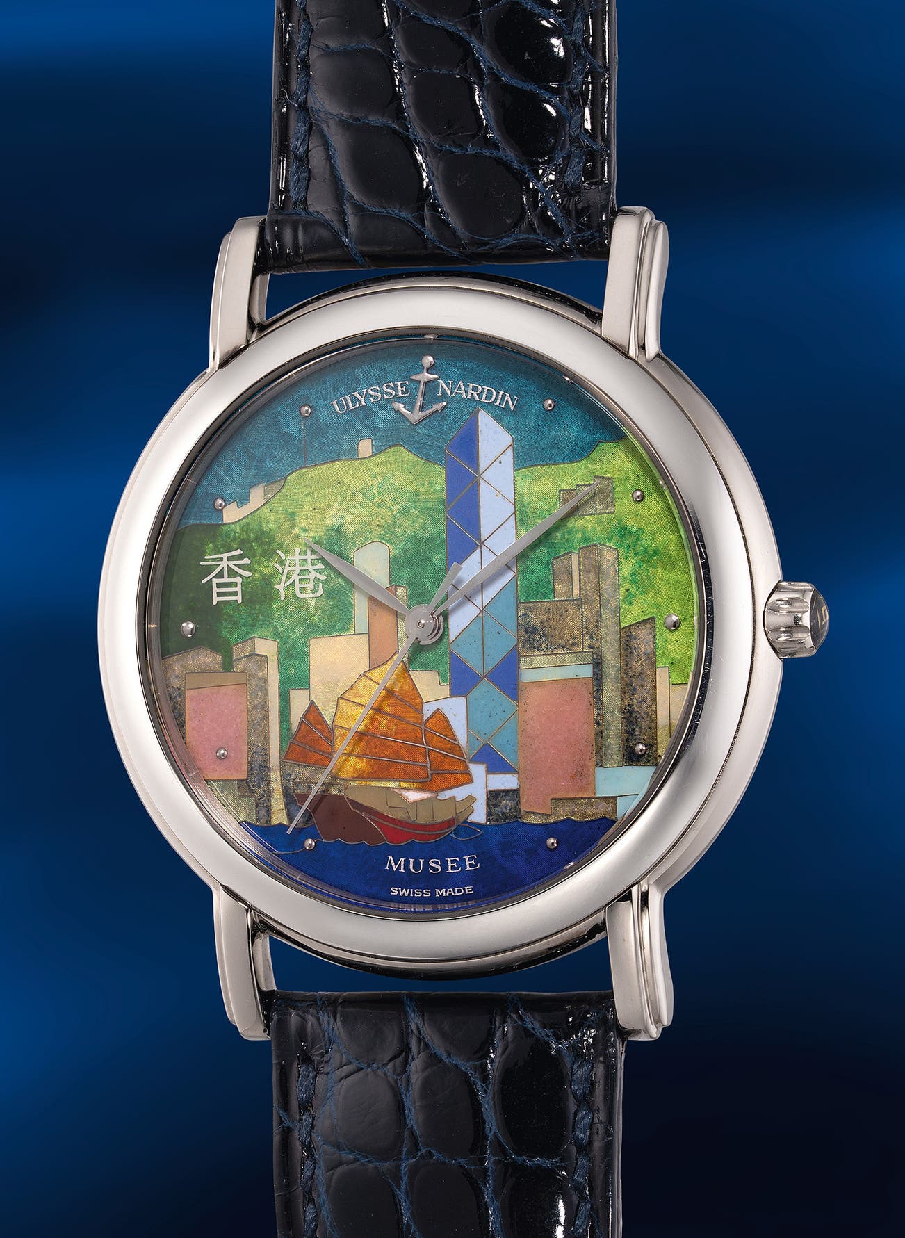 A well-preserved, unworn and possibly unique platinum wristwatch with center seconds, Hong Kong Victoria Harbor cloisonné enamel dial, certificate and presentation box, made to commemorate the Hong Kong handover