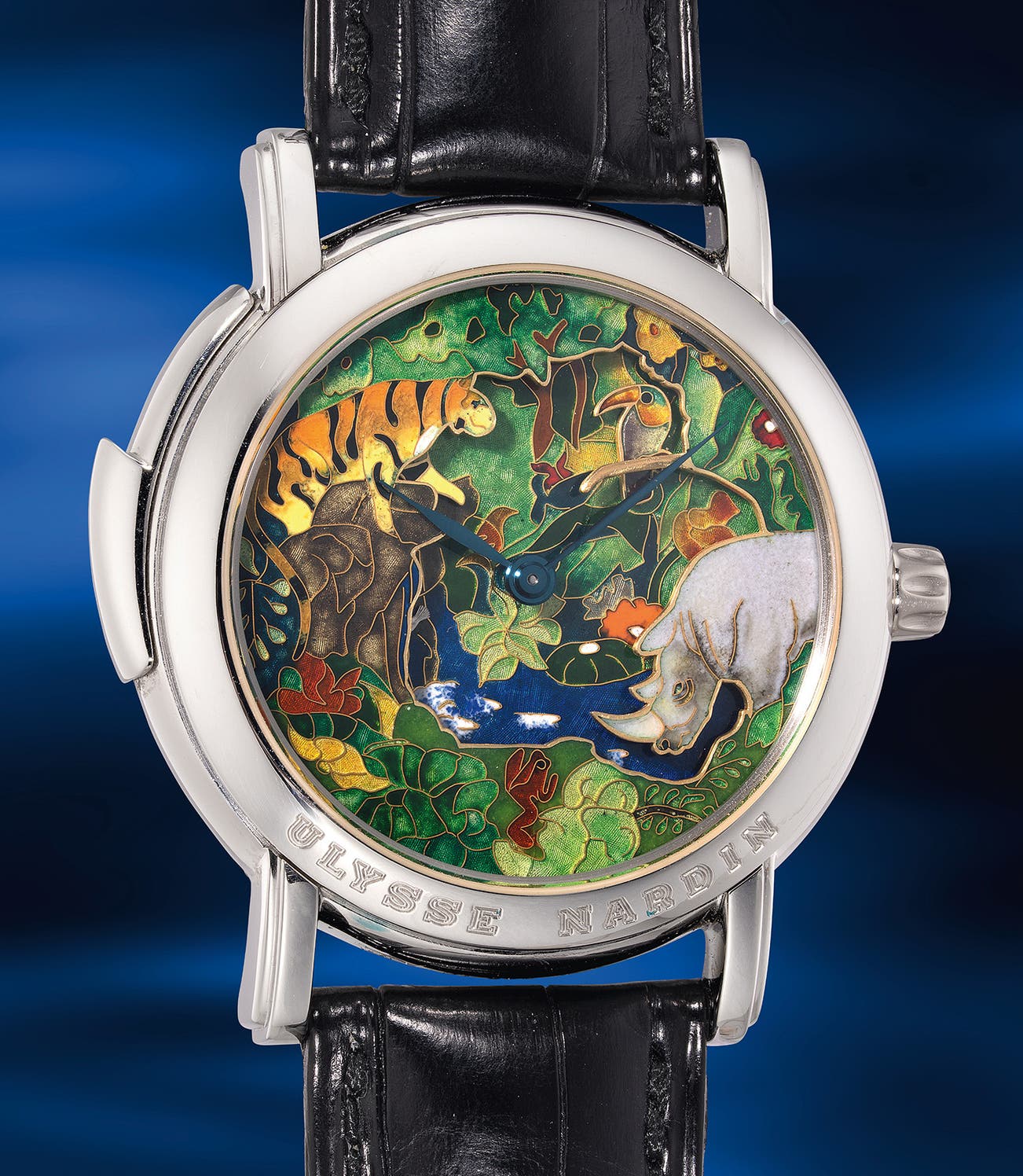 A well-preserved, whimsical, incredibly fine and rare limited edition platinum minute repeating automata wristwatch with cloisonné enamel dial depicting jungle motif and presentation box, numbered 1 of a limited edition of 18 pieces