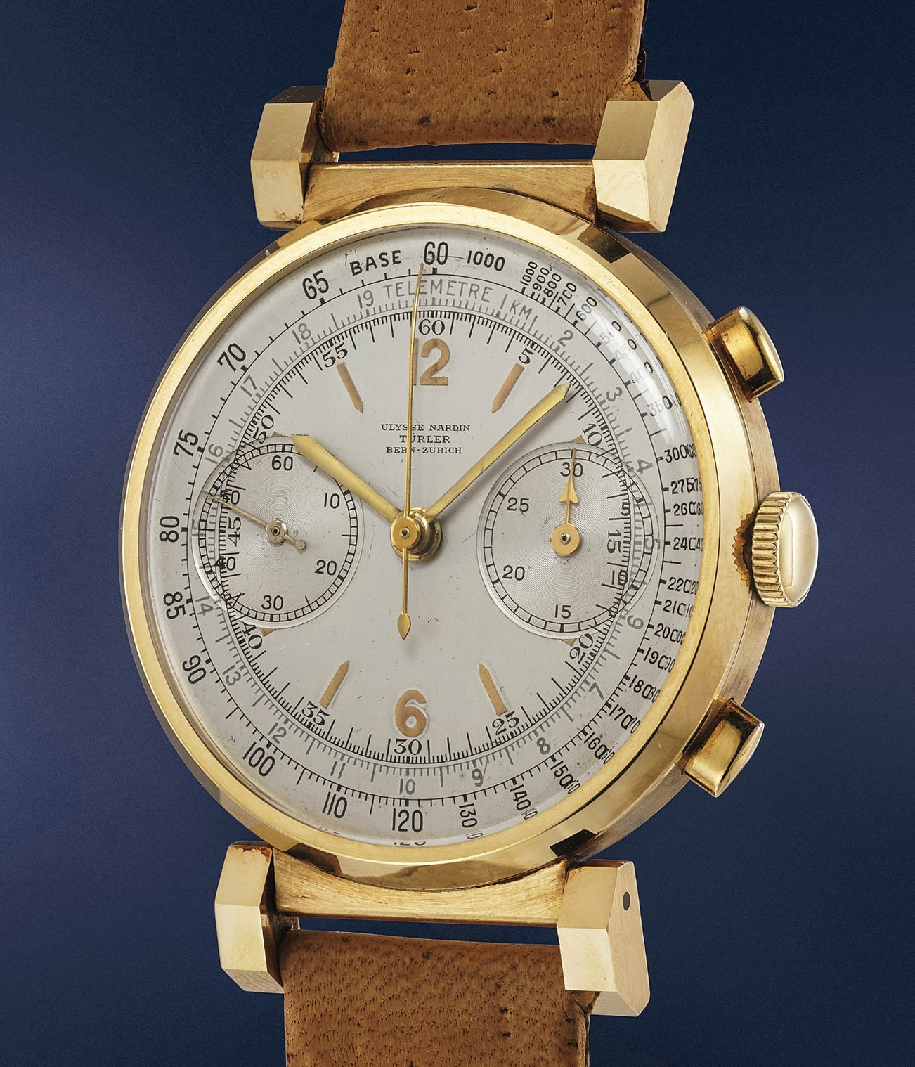 The present chronograph from the 1940s stands out thanks to its large extremely well preserved 37mm case with facetted mobile lugs and beautiful dial featuring a black tachymeter scale and grey telemeter scale.