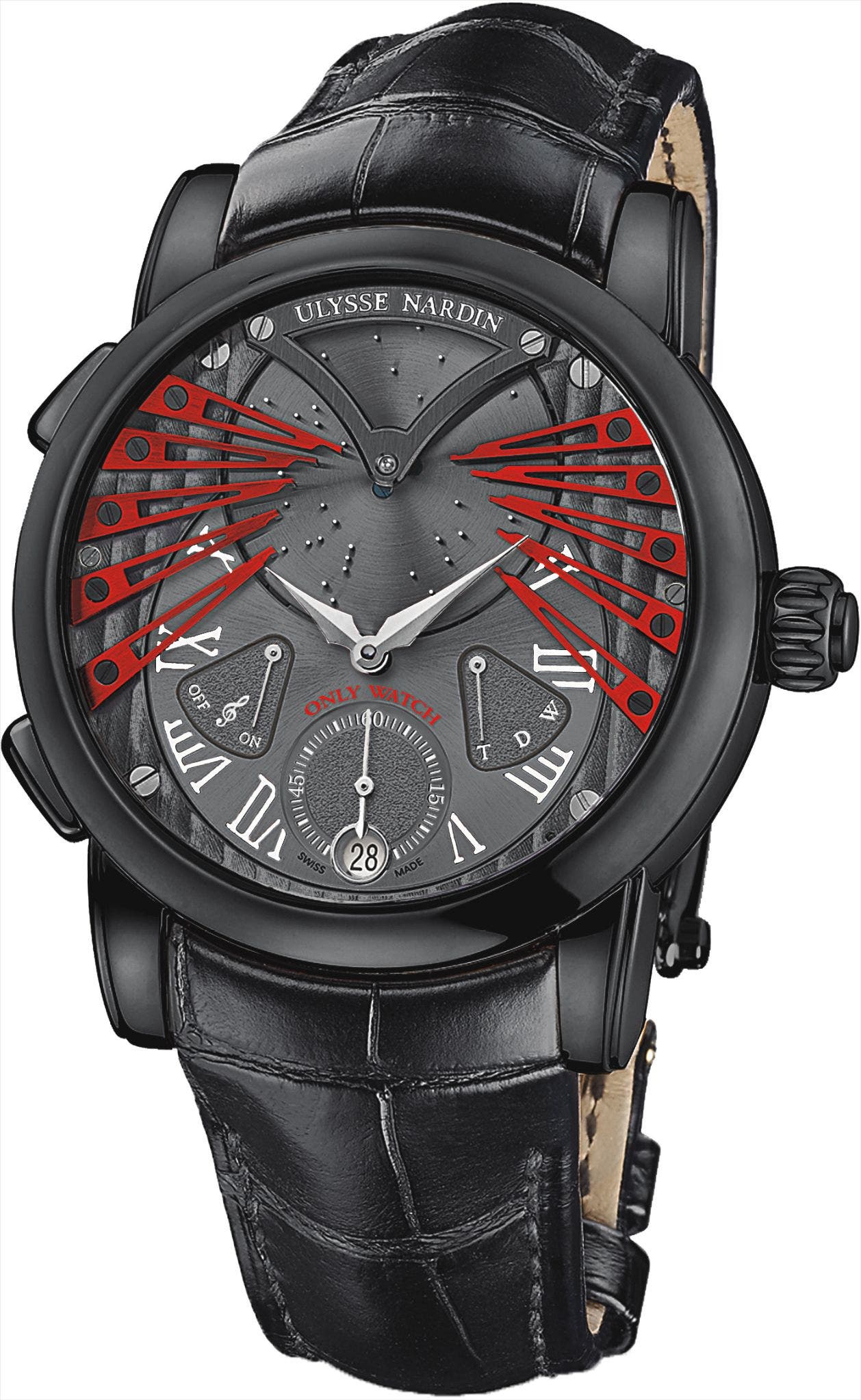 For Patrik Hoffmann, CEO of Ulysse Nardin: “an organization with a good cause as impressive as The Monaco Association against Muscular Dystrophy is led by champions for champions. This motto was the inspiration for the “Only Watch Ulysse Nardin Stranger” timepiece, playing the melody ‘We are the Champion”, written by the famous compositor of Queen, Freddie Mercury. Integrating the latest technology in watchmaking, it is housed in a black titanium case.”