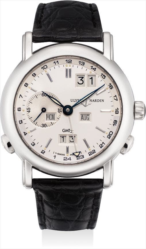 With its unusual dial and in excellent condition, the present watch features both a dual time and perpetual calendar function. It comes with a full set including a Ulysse Nardin certificate, Contrôle Officiel Suisse des Chronomètre Watch Rate Certificate, product literature, fitted presentation box and outer packaging.