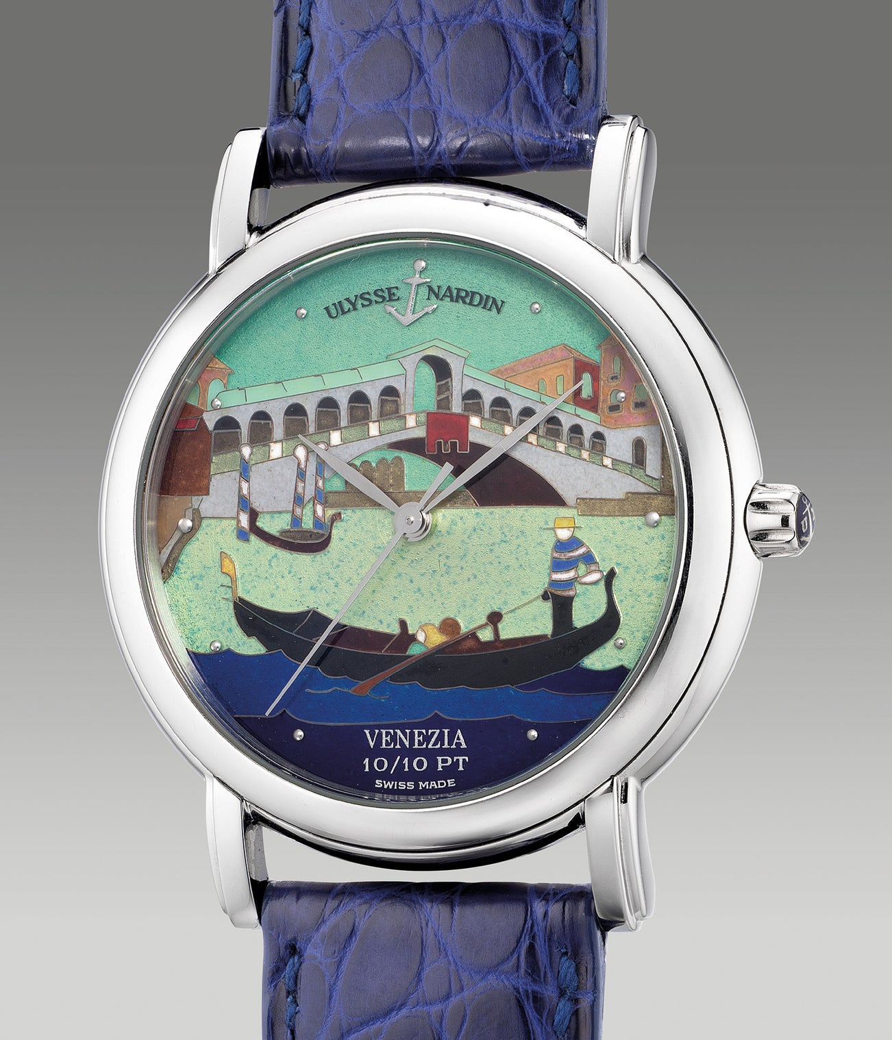 The present Ulysse Nardin San Marco Chronometer features a beautiful cloisonné enamel dial depicting the Rialto Bridge of Venice. Regarded as the city’s most famous sight, the Rialto Bridge was built in the 16th century, and for many years it was the only bridge connecting the two halves of the floating city. Portrayed through the method of cloisonné enameling, the meticulous process of achieving such scene required over 26 baking processes requiring over 50 hours to completion.