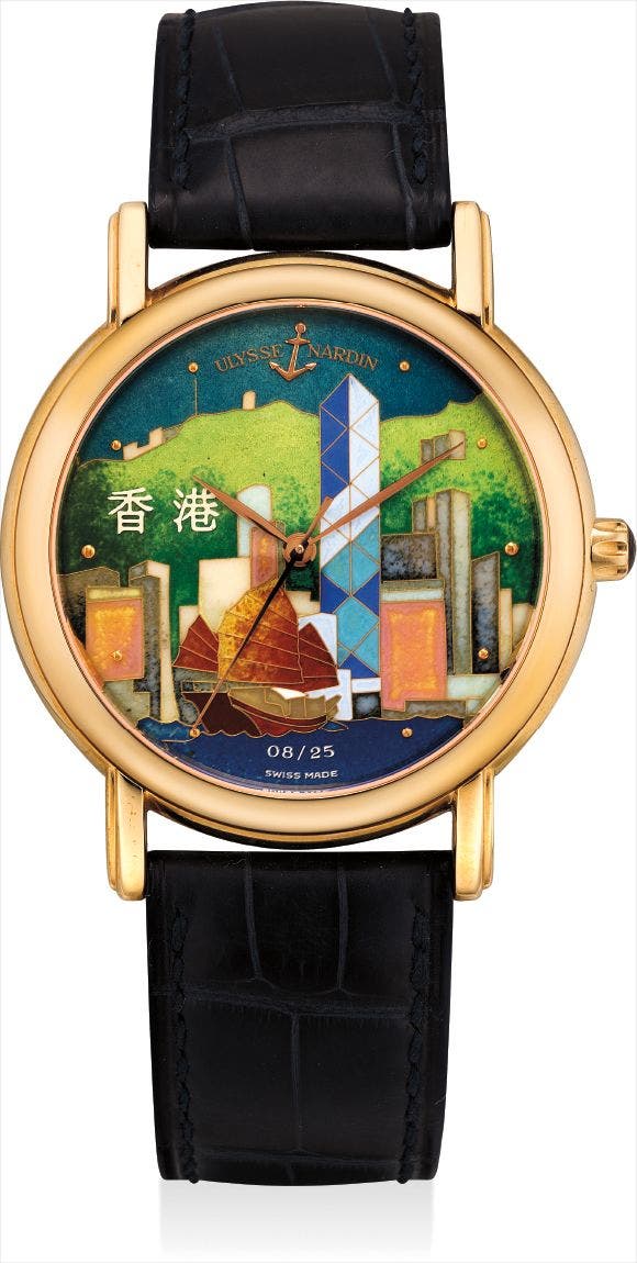 Made in a limited edtion of 25 pieces for the Asian market, the present wristwatch is blessed with an exquisite polychrome cloisonné enamel dial representing a view of HK harbor. The geometric, multicolored scene features a boat in the foreground, the Hong Kong skyline behind it (with the iconic Bank of China tower) and the green Peak in the background: the perfect scene for the depth and vibrancy of the cloisonné enamel to, literally, shine through.