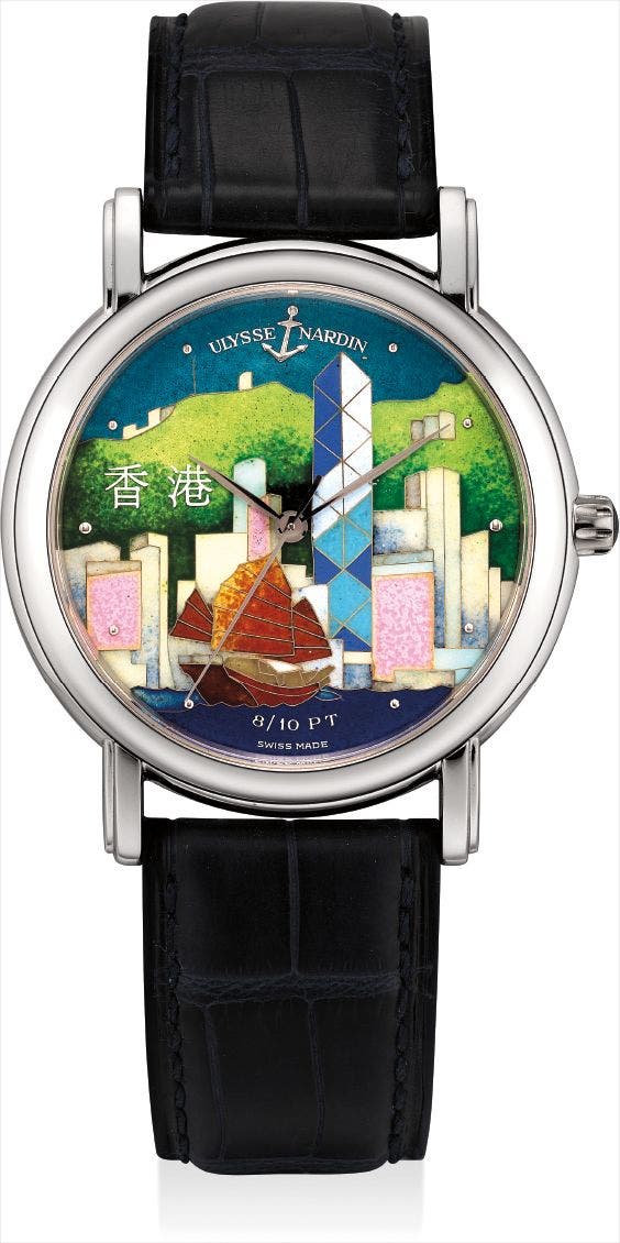 Part of the series of enameled timepieces celebrating Hong Kong with a view of it's harbor, skyline and Peak, this platinum iteration was made in only 10 pieces, this being number 8.