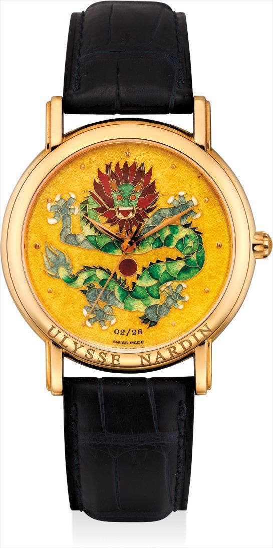 Part of the fascinating and extremely attractive series of limited edition enameled Ulysse Nardin timpieces, the present watch is a tribute to Chinese culture and folklore with its green dragon - historically symbol of the Emperor of China - on yellow field - for thousands of years the Chinese royal color: only the emperor was allowed to wear yellow. As prominently stated on the dial, this is number 2 of 28 pieces made.