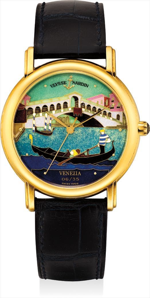 The present watch features a polychrome cloisonné enamel dial depicting Venice Italy. A gondolier floats in the foreground, while the Rialto Bridge is seen in the background. The bridge is the oldest of the four bridges that span the Grand Canal in Italy, and it originally was the dividing line between the San Marco and San Polo districts. San Marco is one of the 16 sestieri (subdivisions) of Venice, and is the heart of the city, home to many of the city’s most recognizable sites including St. Mark’s Square and Basilica, as well as the Doge’s Palace. Number 6 of 35 example, this present watch is a highly charismatic and presented in lovely overall condition.