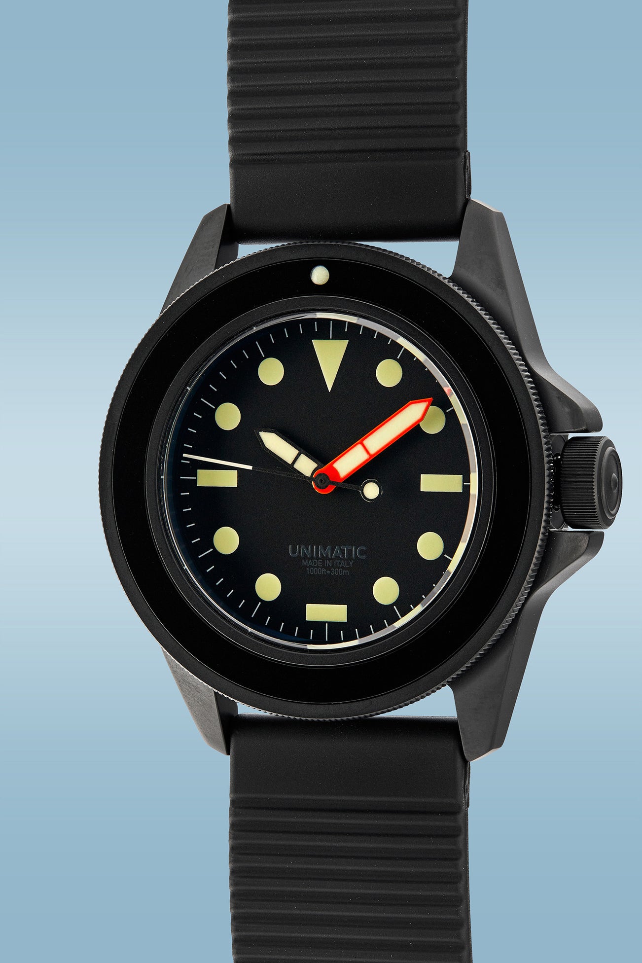 The UNIMATIC x Massena LAB trilogy sought to envision modern examples based on the past. The reference ML6 with red triangle on the bezel and tropical dial is a 21st interpretation of what a 1950s UNIMATIC would look like today. The MLM with blue dial and bezel sought to capture a 1960s dive watch for the French Navy. The MLB, the last in the series with an all-black dial, ghost signature and Super-LuminNova indices, was a 1970s representation of the Blancpain “Bund” wristwatch worn by the West Germany Navy elite special forces - the Bundeswehr Kampfschwimmers.