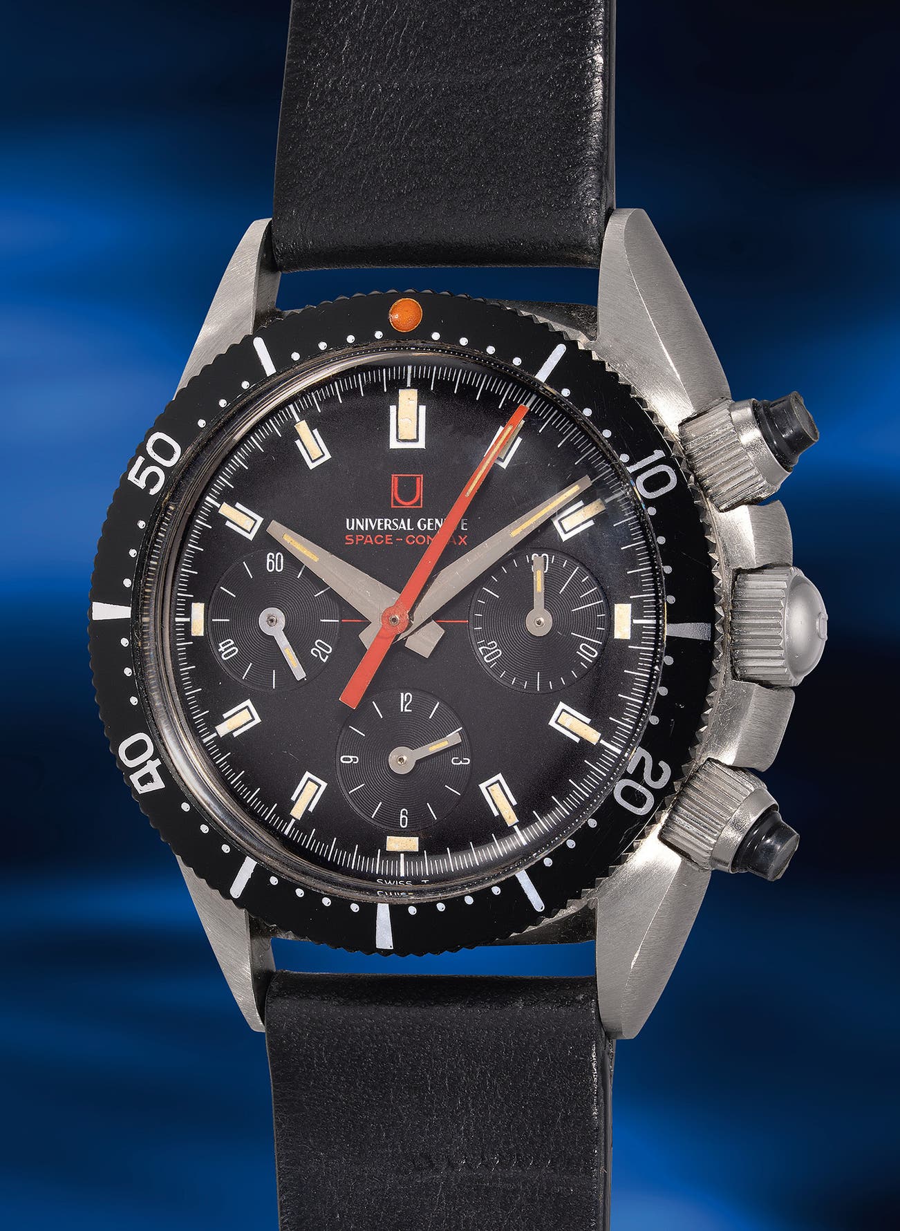 One of Universal’s most unusual yet attractive chronograph designs was the Space-Compax. Produced in two generations, the present lot belongs to the MK II generation, made in limited numbers.