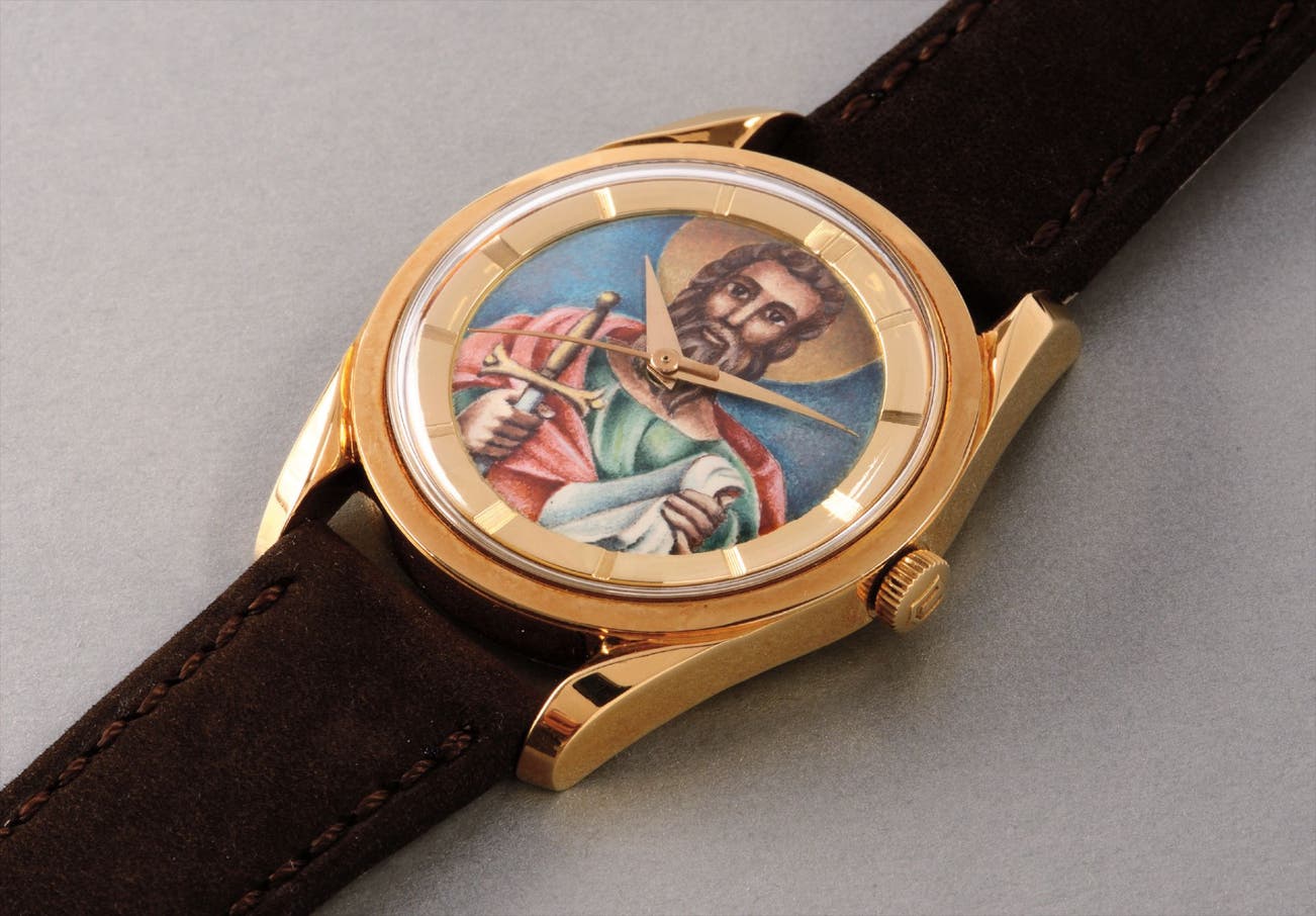 The most impressive feature of the present lot is its exquisite, polychrome enamel dial featuring St. Paul, Patron Saint of Malta. Its caseback is inscribed “H.E. Card. W. Godfrey from Baron de Piro d’Amico Inguanez Malta MCMLX" (1960). This watch was commissioned by the Maltese noble man, Baron Jerome D'Amico Inguanez, the 7th Marquis De Piro and 8th Baron of Budaq and presented to the Archbishop of