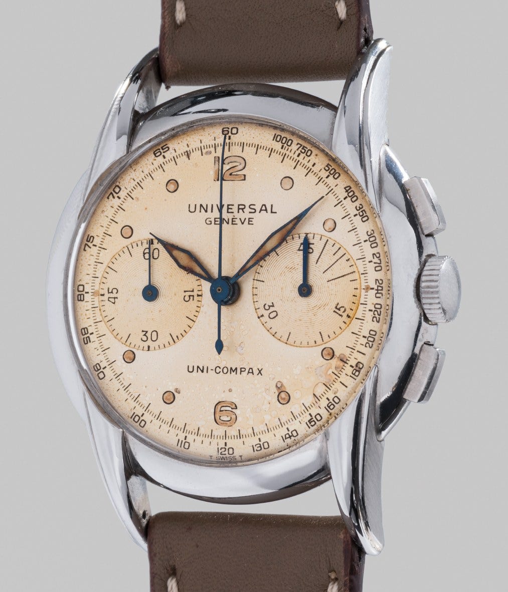 In 1917, Universal Genève created its first ever chronograph wristwatch. Some 18 years later, it launched its first “Compax” watch, with many variations to follow. Today, vintage Universal Genève chronographs are especially sought after thanks to their extraordinary diversity, appealing designs, and large, well-proportioned cases.