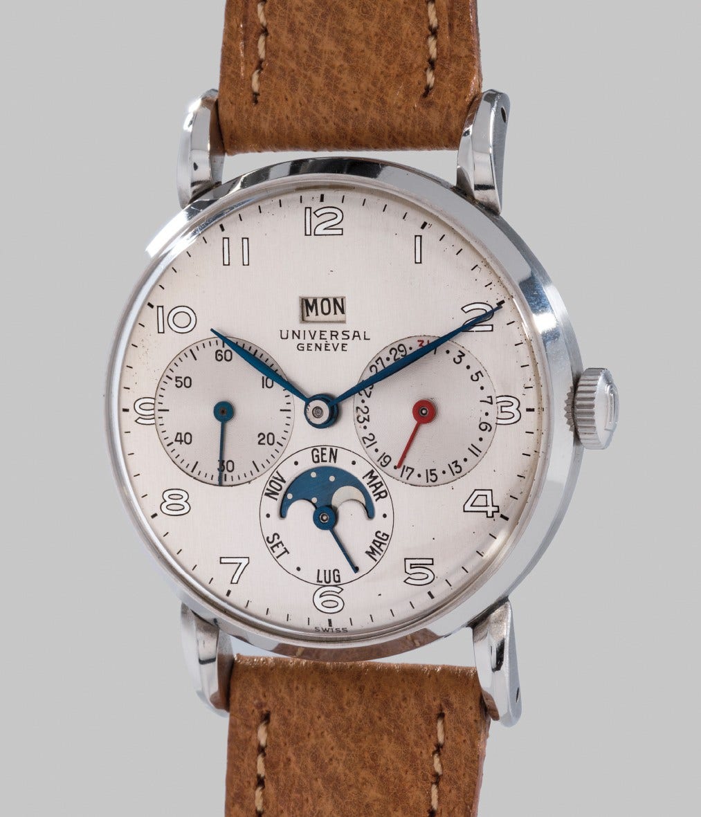 A complete family of chronographs would follow under the name "Compax". However, Universal Genève did not only produce chronographs - it also had an exclusive collection of calendar watches, like the present one. This triple calendar displays the day in a window at 12 o’clock, and the month, the date and the moonphases in the subdials.