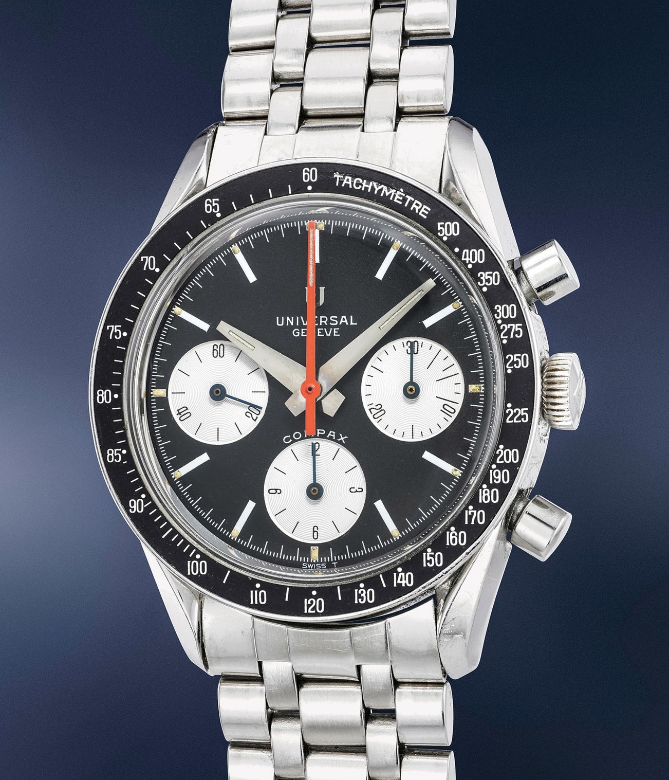 The series of timepieces bearing reference number 88510x was Universal’s answer to the Rolex Cosmograph Daytona, as eminently evident by the striking resemblance between the two watches. The two better known representatives of the model are arguably those bearing reference 885103/01 and /02, perfectly mimicking the color scheme and overall looks of their main competitor the Daytona (case in point: the bezel with black insert and tachymeter scale). This model is a first generation example, evidenced by the applied Universal logo at 12 o’clock. Later examples instead feature a printed logo.