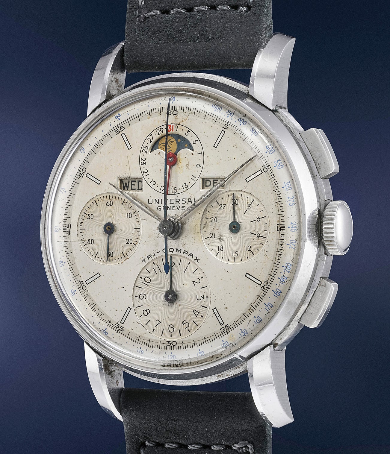 The number of complications could have made the dial look very busy but Universal, succeeded in creating a design which left the dial uncluttered and easy to read. The chronograph counters are classically placed at 3, 6 and 9 o’clock whereas the calendar indications are placed on the top tier of the dial for better balance and legibility.