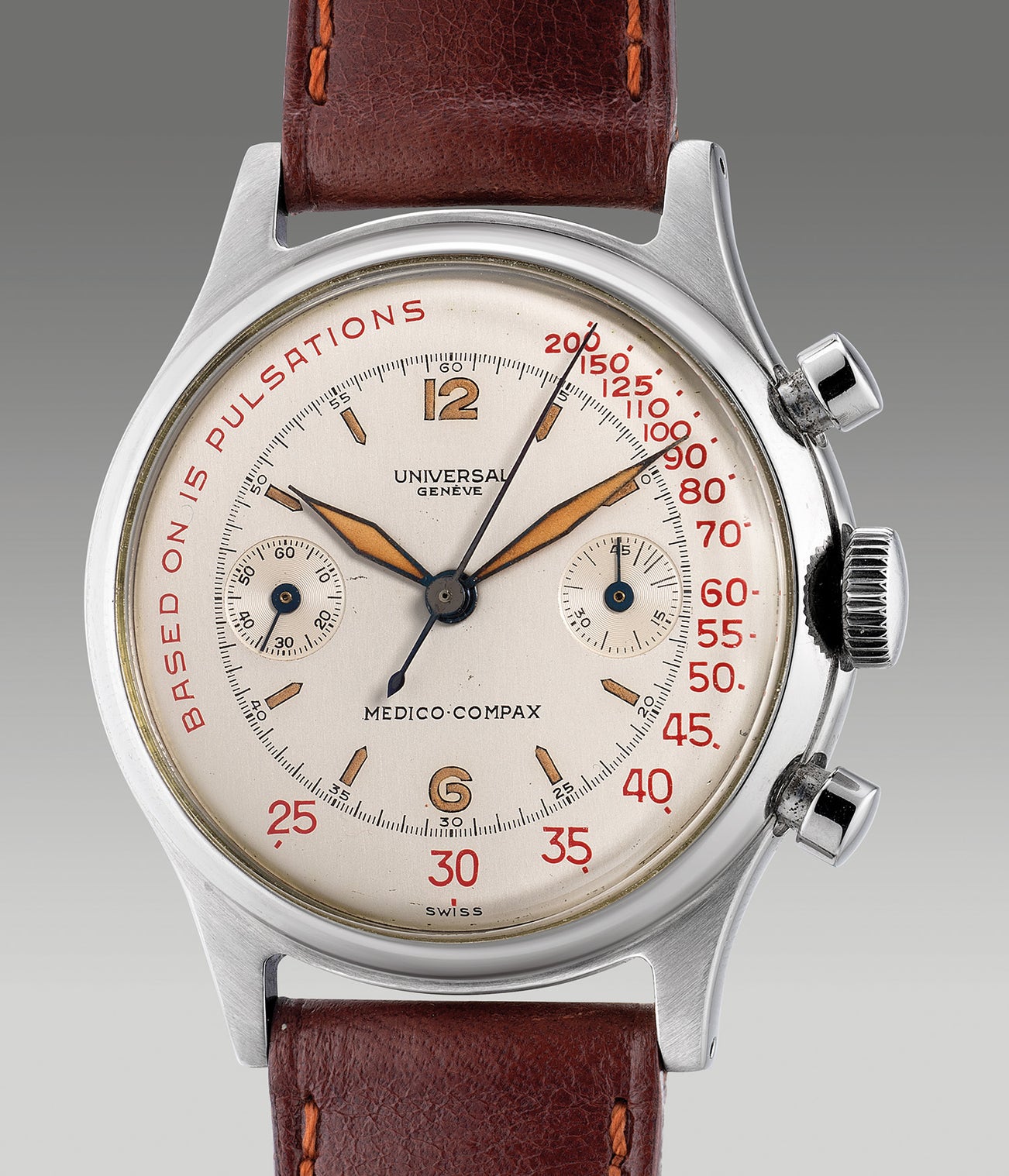 Precision built for fundamental necessity during the 1940s, the Universal Genève Medico-Compax is designed for the medical profession. Based off the more common Uni-Compax collection produced by the firm, the Medico-Compax features a two-register chronograph and a rare red pulsometer scale on the outer track of the dial adorned by collectors. To calculate heartrate, the wearer simply has to count 15 beats and stop the chronograph to get the equivalent heart rate per minute.