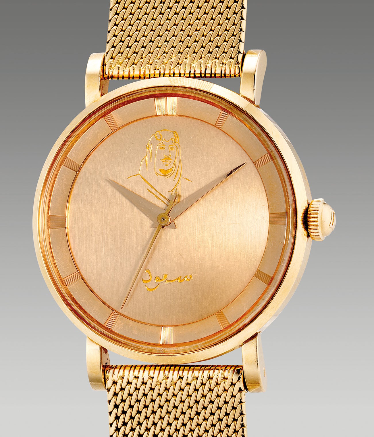 A rare and attractive pink gold wristwatch with center seconds, royal portrait engraved dial and bracelet, made in homage of King Faisal of Saudi Arabia