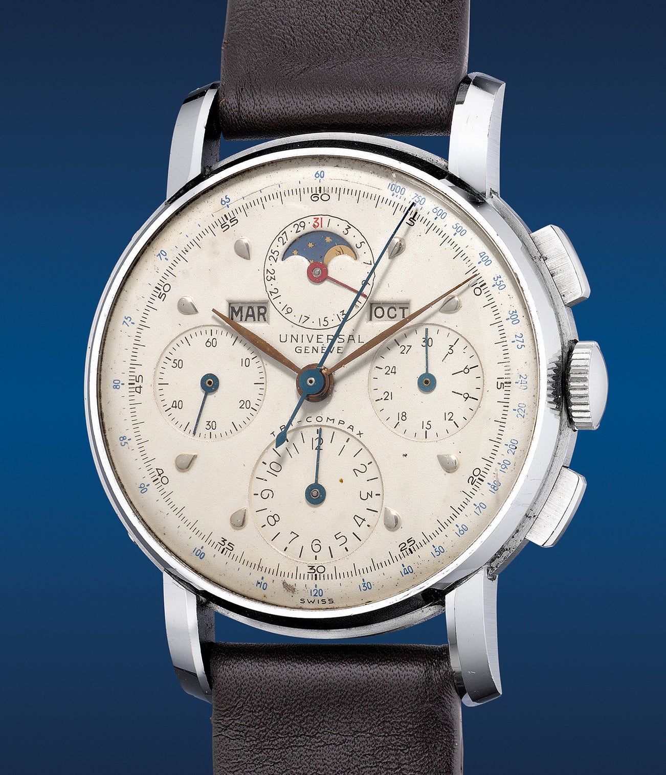 Universal Genève’s Tri-Compax wristwatch was released in 1944 as a celebration of the firms 50th anniversary, as well as a successor to their first release of the iconic Aero-Compax introduced in 1936. Today, vintage wristwatches by the firm are highly sought after for their modern mid-century aesthetics and superb quality with offerings such as the Uni-Compax, the famed Polerouter designed by young Gerald Genta, and last but not least the present model, the Tri-Compax. Considered to be one of the most complicated timepiece made by the Geneva based watch company, the timepiece is named after its three complications: triple calendar (day, date and month), chronograph and moon phases.