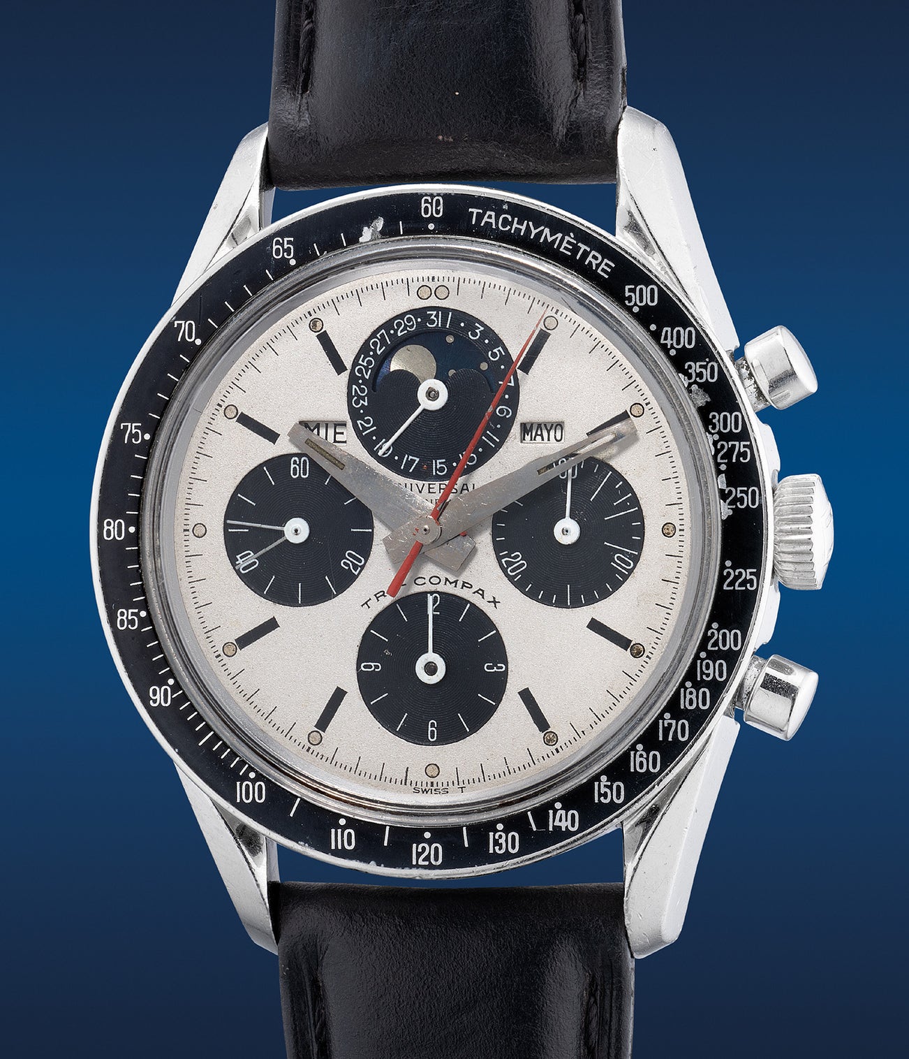 The Tri-Compax is probably one of the most complicated watches made by the Geneva based watch company. Named after its three complications: triple calendar (day, date and month), chronograph and moon phases, the first generation was launched in 1944 to commemorate the manufacture’s 50th anniversary. The ground breaking design of the dial matches the quality and the complexity of the antimagnetic chronograph movement. Here Universal succeeded in the challenge of featuring multiple indications on the dial whilst maintaining a perfect balance and harmony between the sub dials making the use and the legibility of the watch extremely easy and enjoyable. The model soon became the ultimate utility watch for the businessman as the man of science, the aviator and the technician. A second version was launched in the late 60s with a radically sportier design.