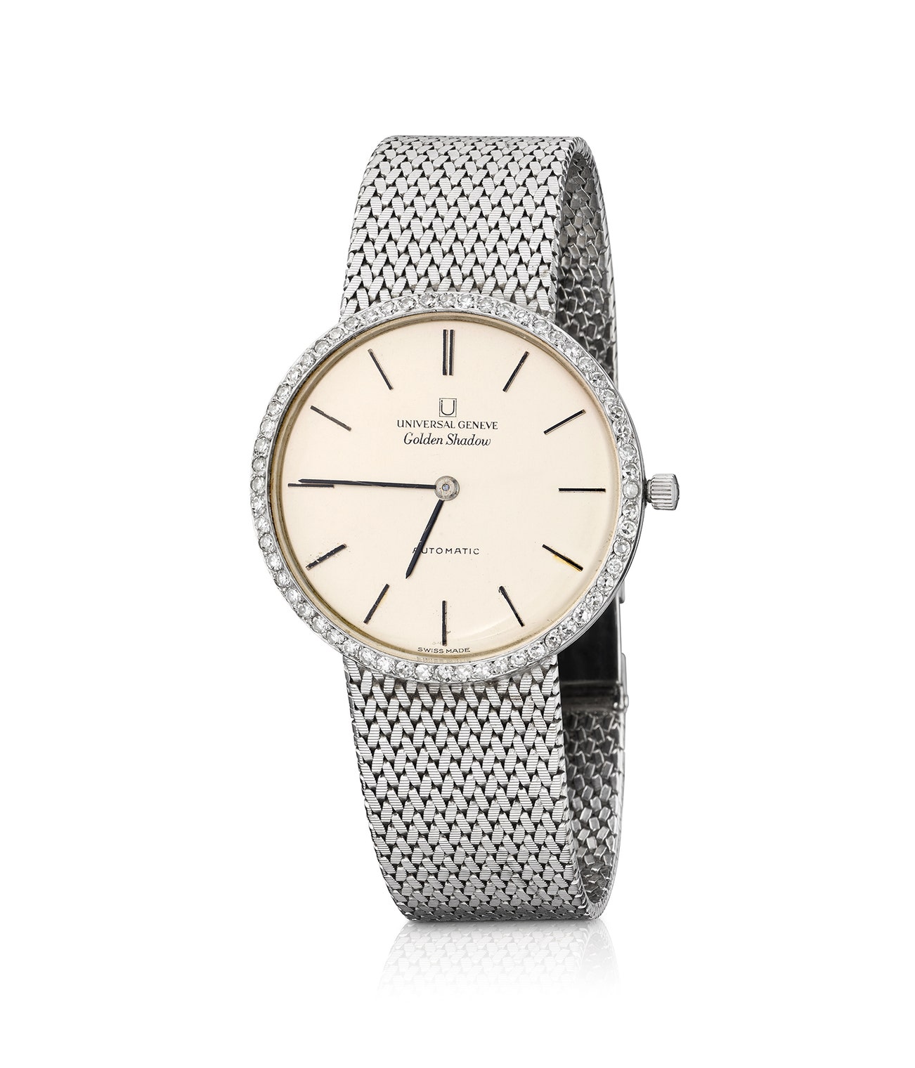 Of automatic movement, silver dial, bezel set with circular-cut diamonds, baton markers, sword-shaped hands, gold mesh strap, diameter 32mm, length approximately 175mm, dial signed Universal, numbered, maker's mark for Universal, Swiss hallmark for gold.