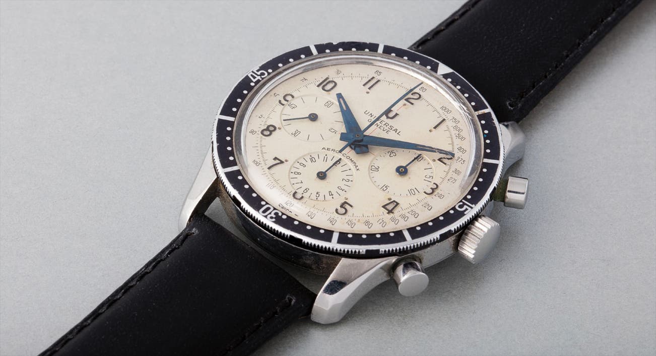 This Aero-Compax was available with either 24-hour or 12-hour dials, the latter being rarer. Whereas the 24-hour watches were fitted with calibre UG90 (based on Venus 178), the 12-hour watches are equipped with Universal's calibre 130 based on the Valjoux 726.