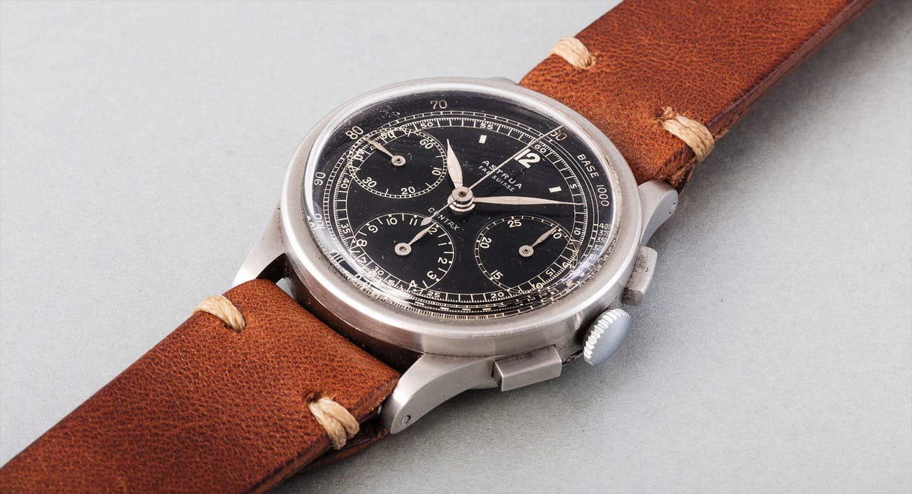This particular Universal, signed by the retailer Astrua, features all those attributes, from its steel case with flat bezel, brushed sides and square push buttons to its stunning black dial.