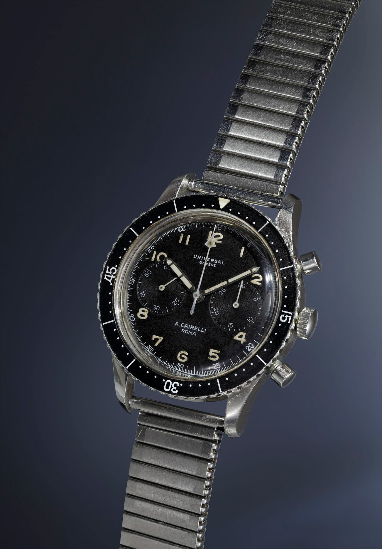 An extremely rare, oversized and important stainless steel fly-back chronograph wristwatch with black dial, rotatable bezel and expandable bracelet, presented with original delivery slip, produced for A. Cairelli.