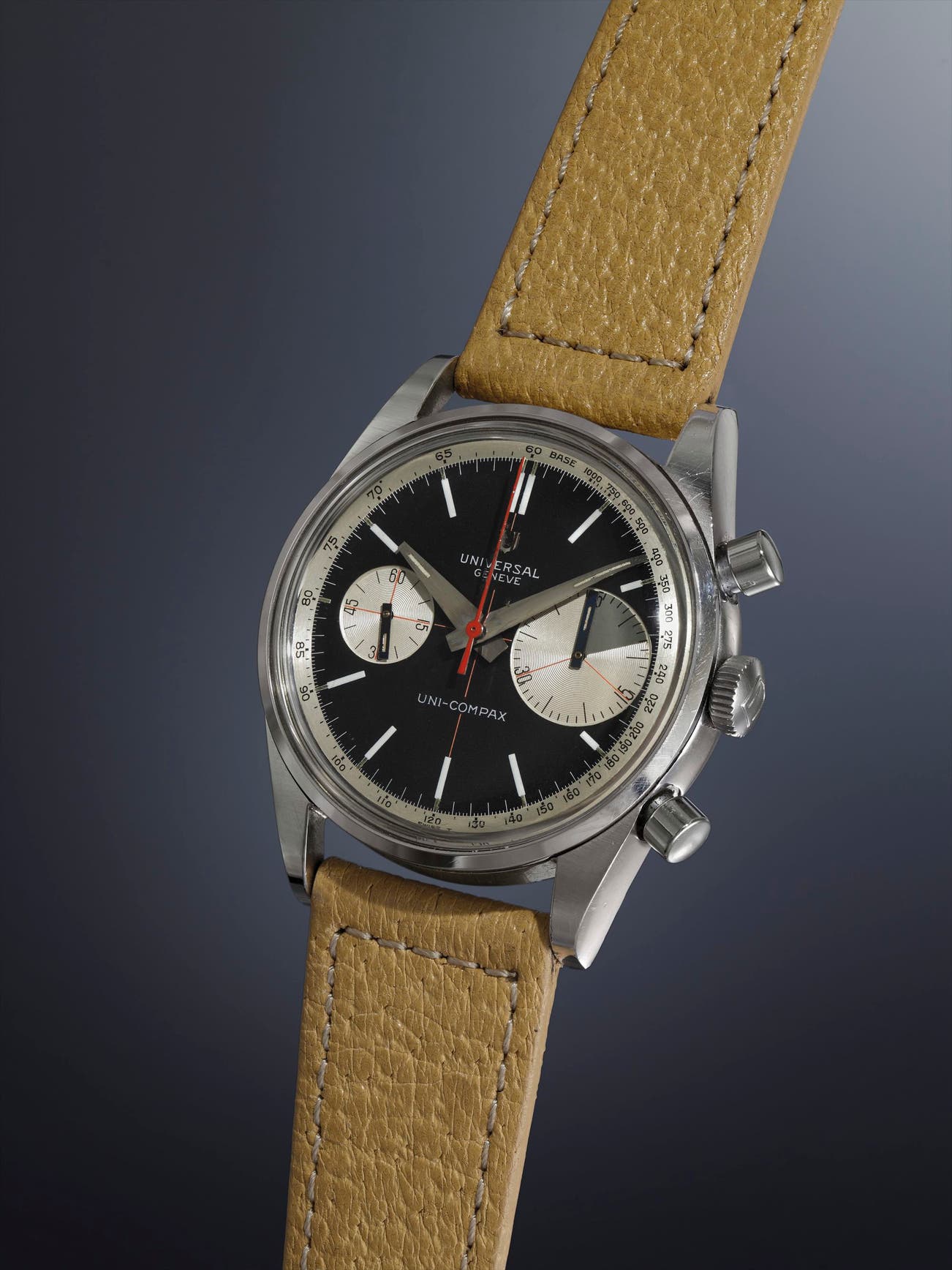 In 1917, Universal Genève created its first ever chronograph wristwatch. About eighteen years later, they launched their first “Compax” model, with many variations to follow: the Dato-Compax, Aero-Compax, and the revered Tri-Compax that featured a complete calendar with moon phases.