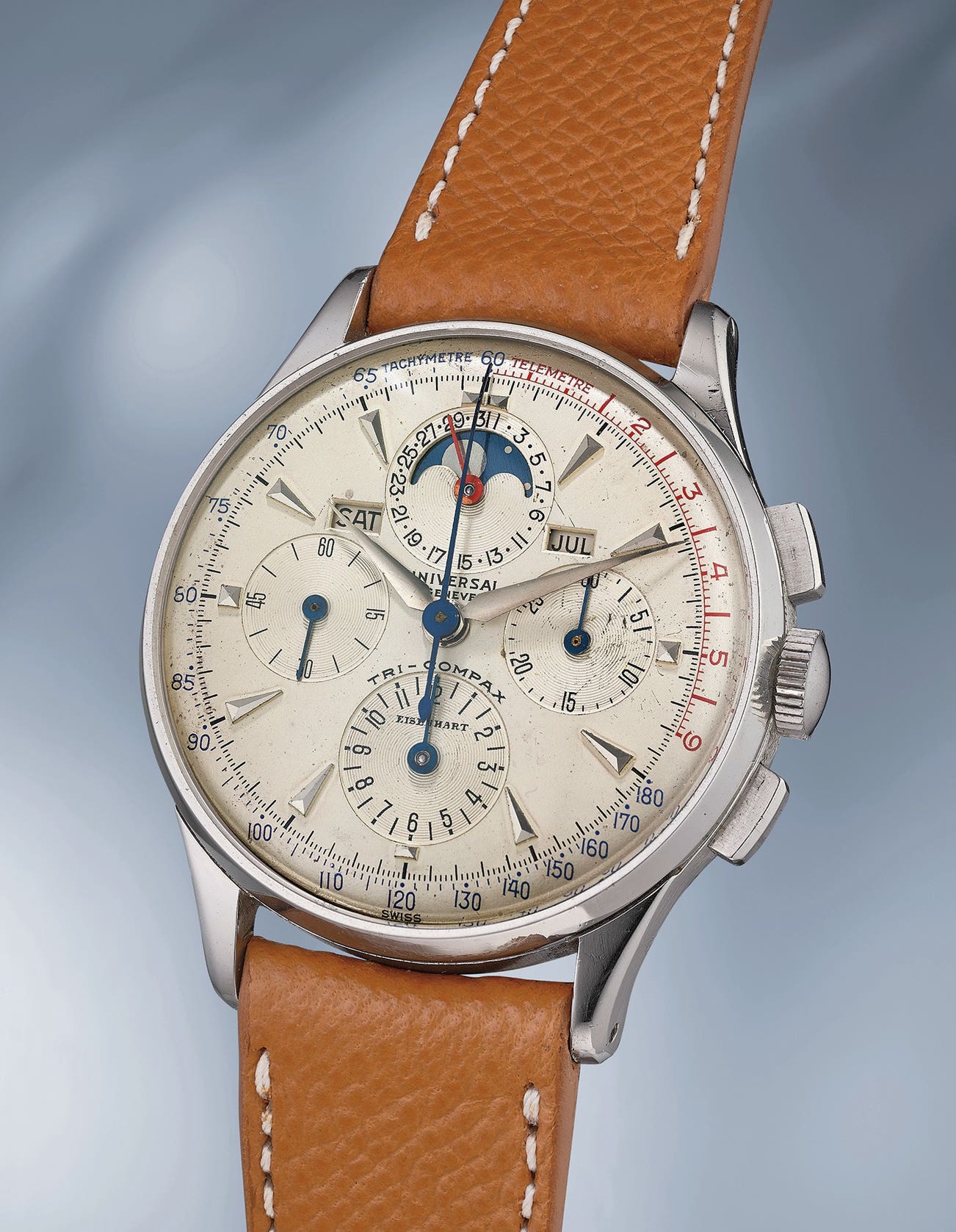 The present Tri-Compax differentiates itself from its peers by the second signature added on its lower subdial. Eisenhart was a jeweler with boutiques in Bern and in Interlaken, Switzerland. To the best of our knowledge, only a handful of watches bear this retailer’s signature. The watch is presented in excellent overall condition, with the original box and even rarer, the original Universal Genève guarantee stamped by Eisenhart and dated August 23, 1958. Just like a time capsule, this watch brings us back in the late 1950s to the Swiss city nested between two lakes where the famous German writer Goethe enjoyed spending time.