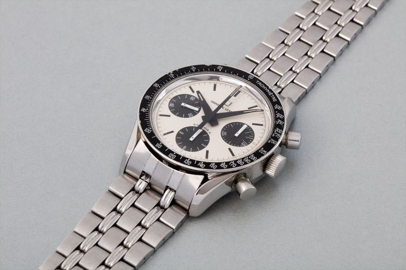This Compax has what’s called a "Panda" dial, which relates to the white base with black sub dials, very similar to the legendary Rolex “Paul Newman” Daytona. Amongst collectors, those Universal Compax reference 885.103 models, is fitted with a tachometer bezel are generally considered the "Nina Rindt" version. Interestingly, towards the end of the production run, Universal also used cases of reference 885.105, which were originally destined to be fitted with a bezel featuring a pulsation scale. As the present watch is an extremely late example, it makes perfect sense that the present Compax has a tachometer bezel given the larger demand.