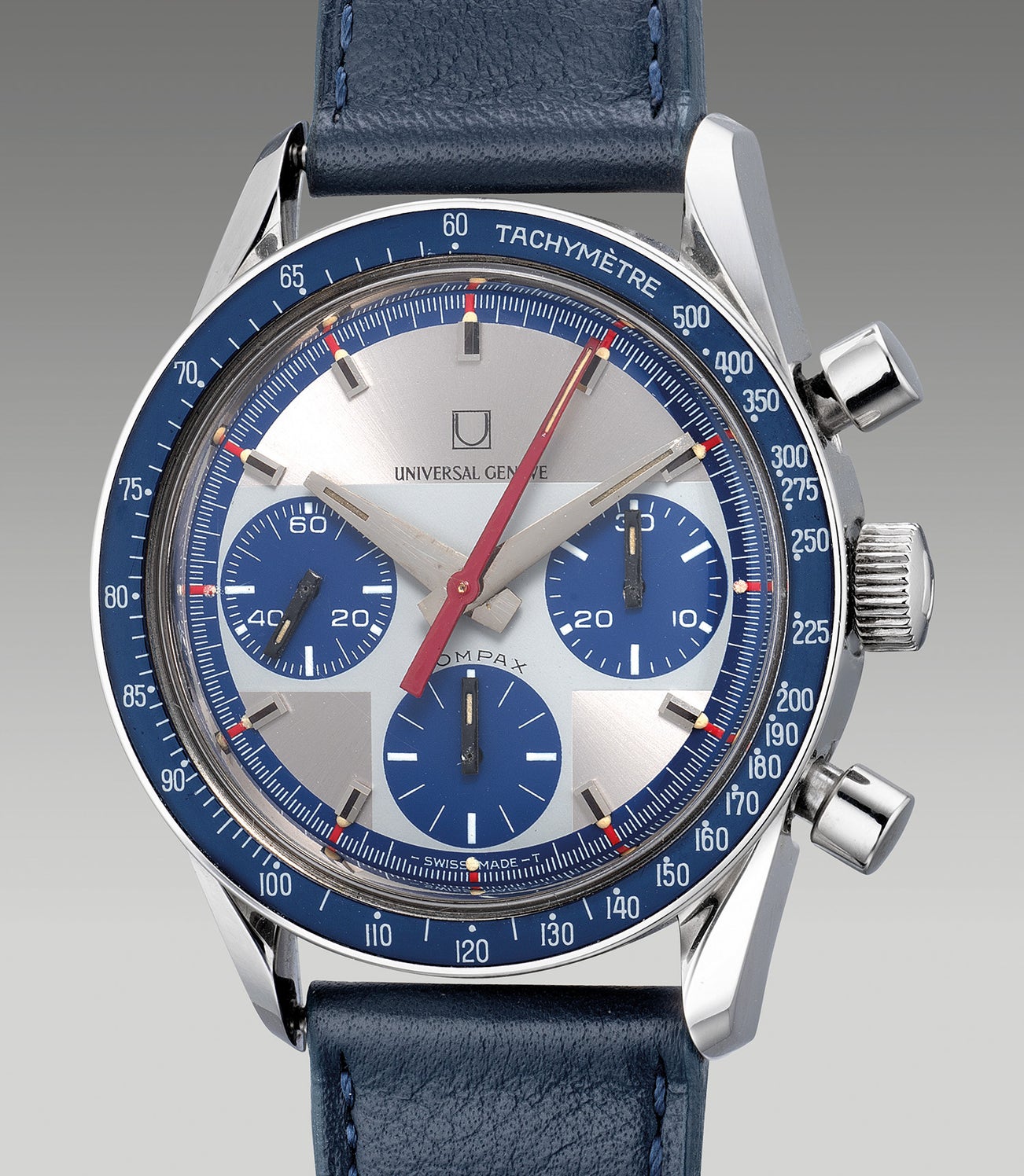 Aptly named the “Exotic Nina”, Universal launched a Compax model that dresses in a far more vibrant blue attire with the reference 885’107 silver dial & 885’108 with a blue dial. The exotic series is not only much rarer than the already scarce panda variants, it is notable that the Exotic Nina in silver is the rarest one of all with less than 15 examples surfaced in the market. Fitted with racing red accents and bakelite blue bezel with matching blue registers, the silver dial with the addition of a defined T-shaped matte silver shimmers in contrast which reminds one of the extremely attractive paint job of an F1 sports car.