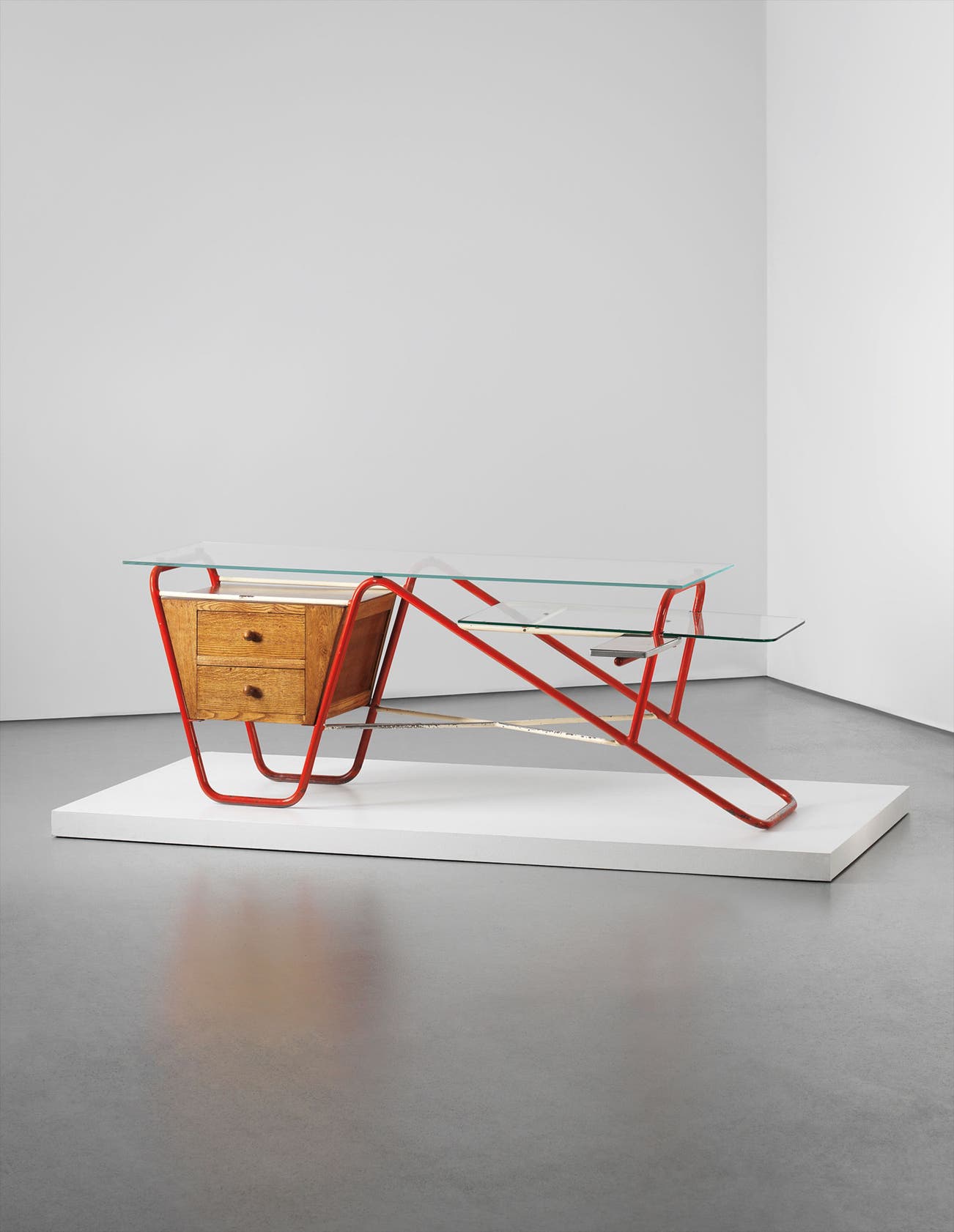 Painted tubular metal, glass, oak