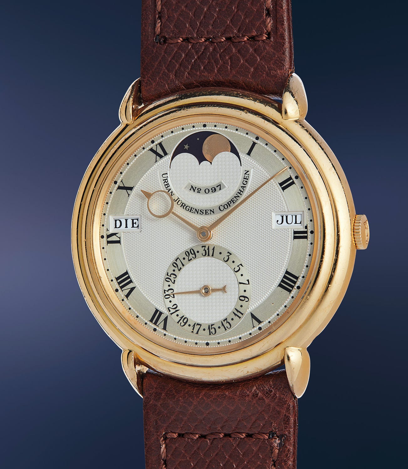 The wristwatches produced during the rebirth of Urban Jürgensen as a brand in the 1980s and 1990s epitomize the marriage of old and new in a way that breathed fresh life into contemporary watchmaking. New owner Peter Baumberger, with his partner, the much-heralded English watchmaker Derek Pratt, set out to rebuild the brand still committed to the original tenets of technical excellence, traditional aesthetics, and handmade master craftsmanship. In all likelihood, this watch, one of a limited edition of 100 pieces, was completely executed by hand by Derek Pratt himself, including the fabricating and finishing of the dial.