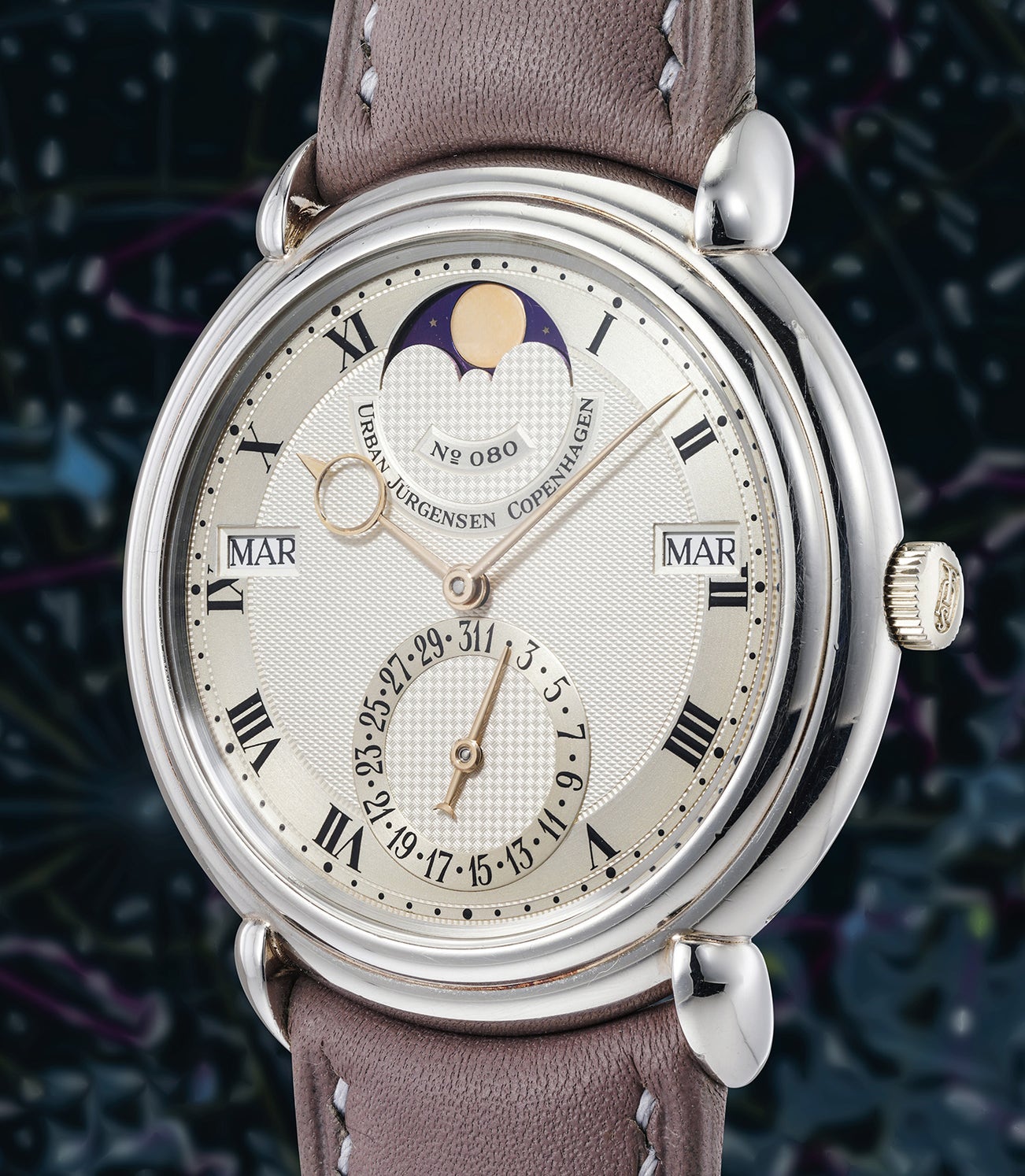 The wristwatches produced during the rebirth of Urban Jürgensen as a brand in the 1980s and 1990s epitomize the marriage of old and new in a way that breathed fresh life into contemporary watchmaking. New owner Peter Baumberger, with his partner, the much-heralded English watchmaker Derek Pratt, set out to rebuild the brand still committed to the original tenets of technical excellence, traditional aesthetics, and handmade master craftsmanship. Aesthetically, the present piece can be considered a pinnacle of elegance: the satin outer track with Roman numerals and simple minute divisions frame the clean guilloché center. Subtle aesthetic details, at first glance easily missed, work behind the scenes to achieve the final effect. One example is offered by the windows which do not feature simply sloped sides, but rather are recessed inside the dial. Another one is given by the fact that the guillochage of dial and subdials is different, and a third style of engine turning is employed to delimit the inner, central and outer boundaries of the satin tracks for the hours and the minutes. The case is perfectly proportioned at 38mm and features classic teardrop lugs.