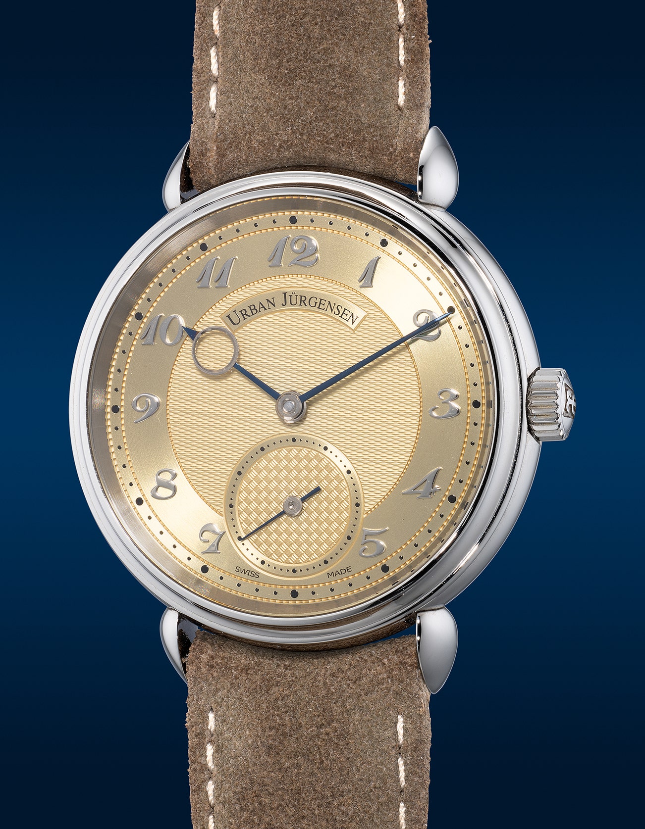 - Urban Jürgensen’s latest interpretation of the ref. 1140 is anchored in the model’s iconic design, while introducing a steel case and champagne dial. Previously offered only in precious metals with guilloché dials and Breguet numerals, the 40mm stainless steel case and pale gold plate dial represent the first deviations from tradition.