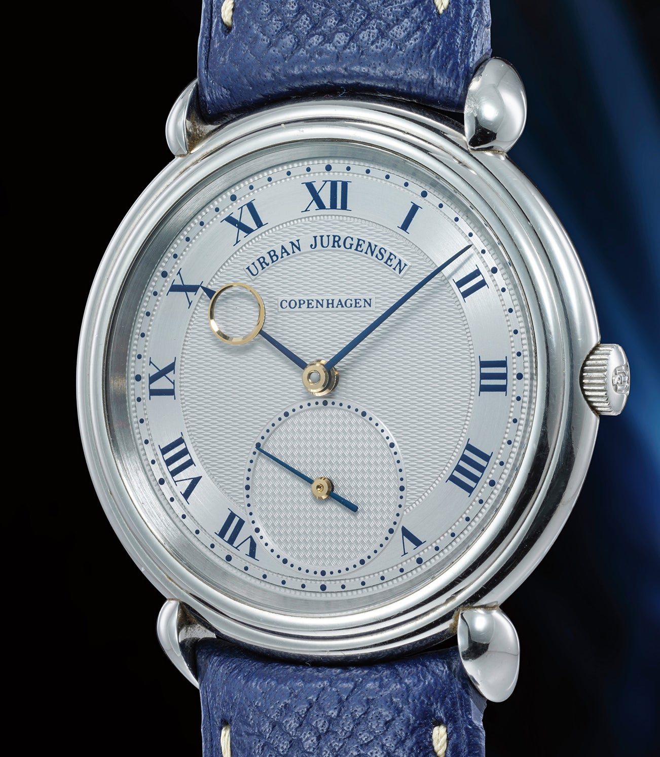 Cased in platinum and consigned by the original Japanese owner, the present watch perfectly encapsulates Urban Jürgensen's design philosophy. An early example made in the 1990s, it most notably displays a 37mm platinum case with immediately-recognizable teardrop lugs and a convex bezel. Finished to perfection, the case has been made in the "traditional" way, meaning that each component has been hand polished and made without the overuse of modern technology.
