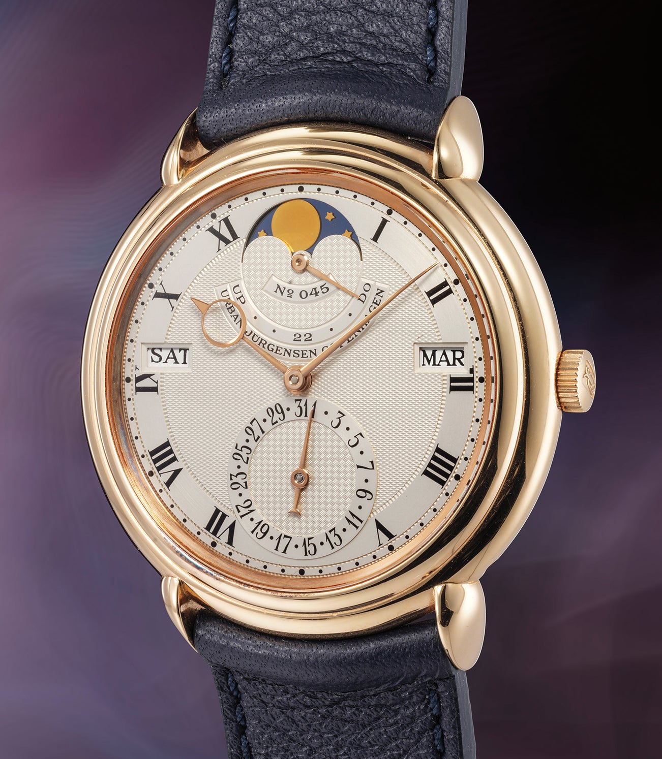 Subtle yet important details add up to make the present timepiece a must have for the savvy collector. The hand guilloché dial requires hundreds of different operations, the satin outer track with Roman numerals and simple minute divisions frames the clean guilloché center. The indication for day, date, month and moon phases are symmetrically placed: the windows for day and month horizontally; the subdials for moon phases and date vertically. The tear drop lugs have been individually forged, heat treated, hand polished and individually soldered onto the watch case in a way which makes the soldering line invisible to the naked eye. The moon disc is also made by hand, it is crafted from mirror polished blued steel, in which the stars are manually inlaid in gold and two solid 18 karat gold, mirror polished moons are fitted. The present Reference 3 also features a power reserve indicator stylishly placed beneath the moonphase display.