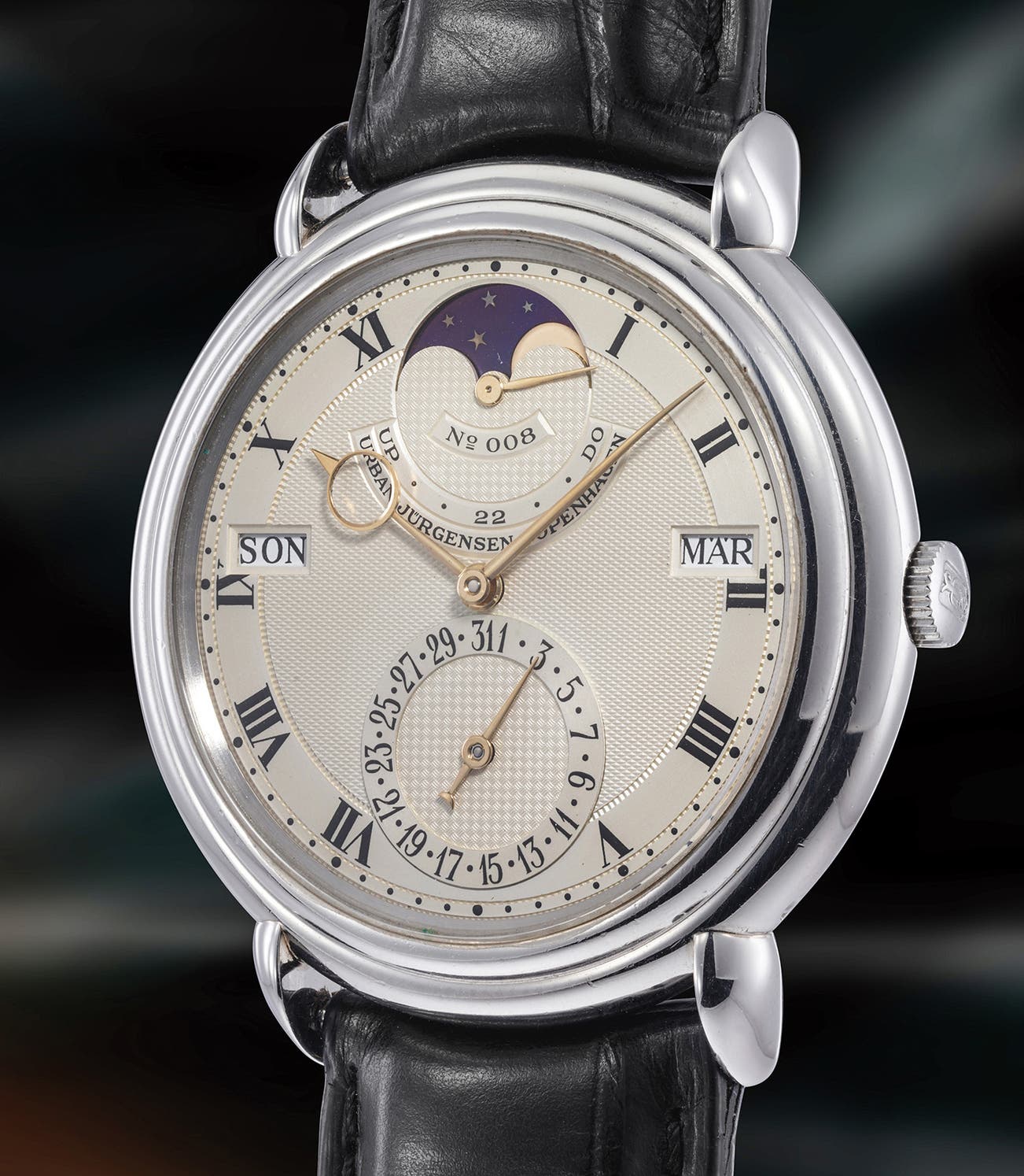 Subtle yet important details add up to make the present timepiece a must have for the savvy collector. The hand guilloché dial requires up to 700 different operations and 2 full days to complete. The satin outer track with Roman numerals and simple minute divisions frames the clean guilloché center. The indication for day, date, month and moon phases are symmetrically placed: the windows for day and month horizontally; the subdials for moon phases and date vertically. The tear drop lugs have been individually forged, heat treated, hand polished and individually soldered onto the watch case in a way which makes the soldering line invisible to the naked eye. The moon disc is also made by hand, it is crafted from mirror polished blued steel, in which the stars are manually inlaid in gold and two solid 18 karat gold, mirror polished moons are fitted.