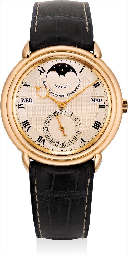 With <em>Urban Jürgensen</em> Extract from the Archives dated February 10, 2017 confirming production of the present watch with solid silver guilloché dial with Roman Numerals #009, round case and teardrop lugs in 1989.