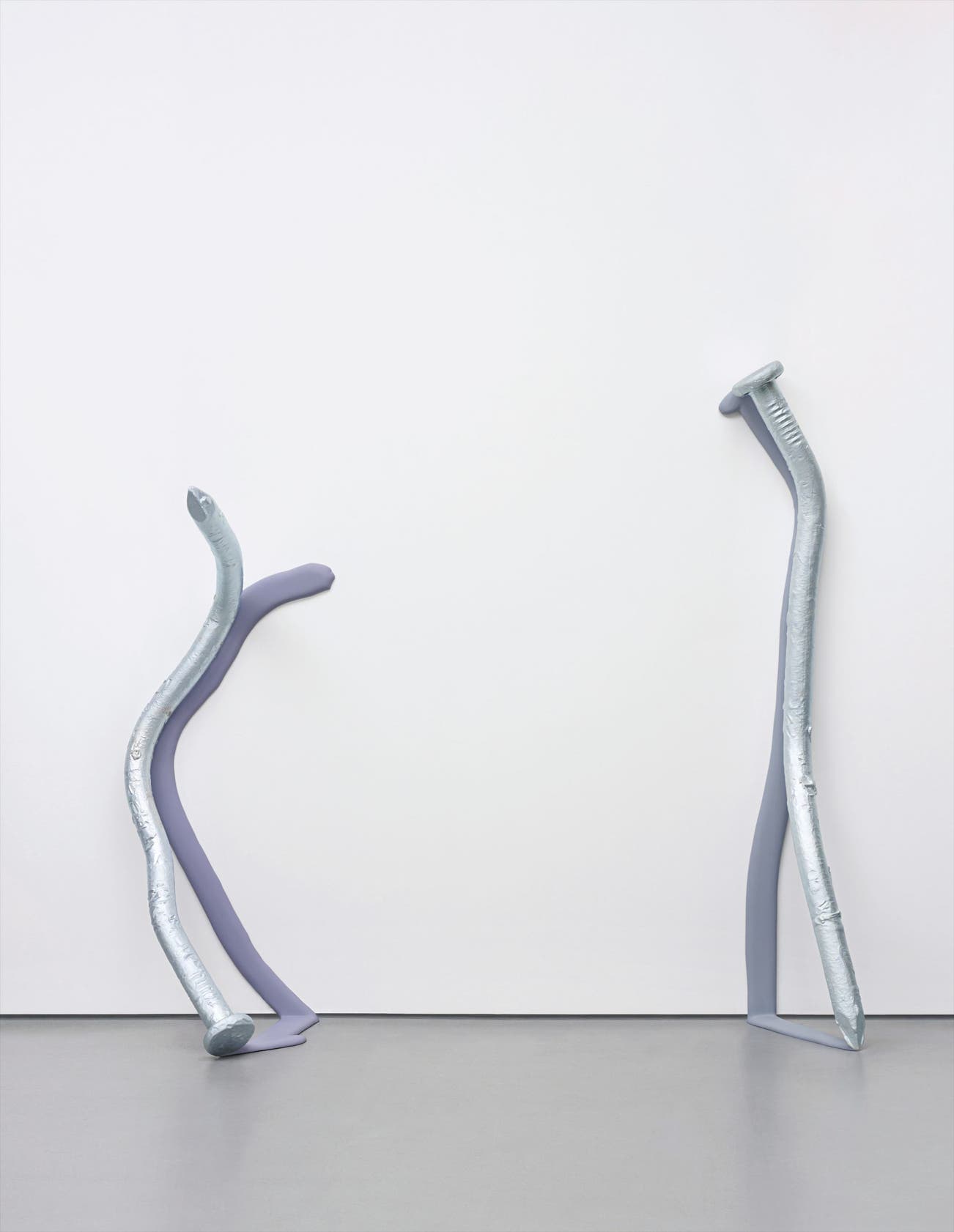 The piece is composed of two nails leaning against a wall, enlarged to human height and cast in bronze, throwing shadows up the wall behind them. The polyester material of these shadows stands in contrast to the bronze sculptures; this juxtaposition of materials, in this case the hard, shiny metal with the soft, matte material behind, is a recognisable technique in Fischer’s work. He uses this to encourage the viewer to reassess the object at hand; the emphasis is on the glean of the metallic blue bronze, highlighting the aesthetic quality of the material and elevating the simple nail further as ‘high art’. Another recurring practice of Fischer’s is instilling a sense of fragility and mortality in his sculptures. Previous pieces such as What if the Phone Rings, 2003 or Rotten Foundation, 1998 are time sensitive, therefore they are vulnerable as their disintegration is imminent. In the present piece, the straighter nail balances on a small point whereas the more distorted nail teeters to the side, giving the sense that they could fall at any point. This fragility gives an element of transience to his works which boldly redefines notions of conventional sculpture, traditionally intended as solid, perpetual monuments.