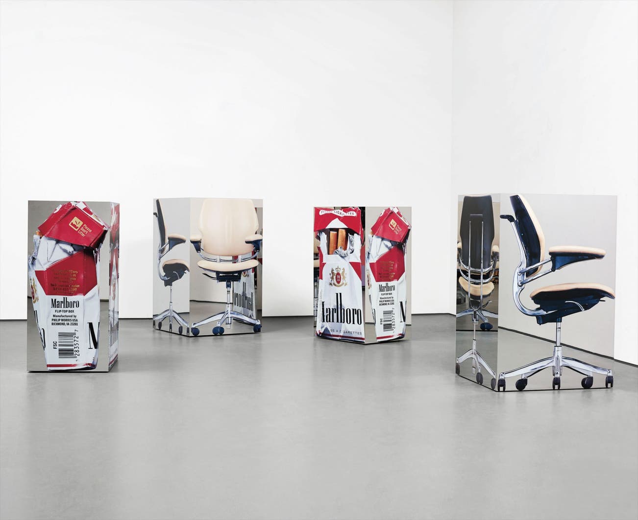 Horse Fraud (2010) is formed of four large rectangular boxes whose sides are printed with photographs of objects seen from various angles therefore each face of a box corresponds with the alternating view of the object portrayed. Thus, a chair is seen from the front, back and sides on one of these boxes. In a manner that nods towards a Cubist visual language, Fischer’s technique allows several angles to be visible at the same time. Facing the corner of one of these sculptures, two view-points are accessible and, as a consequence, the everyday objects portrayed here are imbued with a surreal quality, only heightened by the warped scale of the assemblage. A giant cigarette packet sits beside an equally large office chair. Through their grouping we are made aware of their unrealistic sizes. Concurrently, the iridescent polished surfaces of the chair and torn cigarette packet appear too lustrous given their purpose. The sheen, emphasised through saturated colours, contributes to the appeal and detaches these objects from their transient roles as insignificant items to be used and discarded.