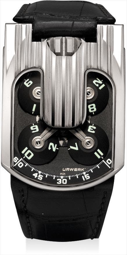 The innovative UR-103 was in production from 2003 until 2010 and available in a range of metals and styles. The present UR-103.09 wristwatch is highly innovative and takes the 103 series to an entirely new level. It features four 3-dimentionsal orbiting and revolving satellites hour display that was designed enabling the wearer to read the time with ease in all occasions. These four hour satellites of the 103.09 edition are crafted in aluminium to minimise mass and thus maximise chronometric efficiency. The case back is fitted with a control board that features a 36 power reserve indicator, a chronometer with minutes and seconds to facilitate accurate time-setting and a precision adjustment screw enabling the owner to regulate the timing of their own timepiece according to their own needs.