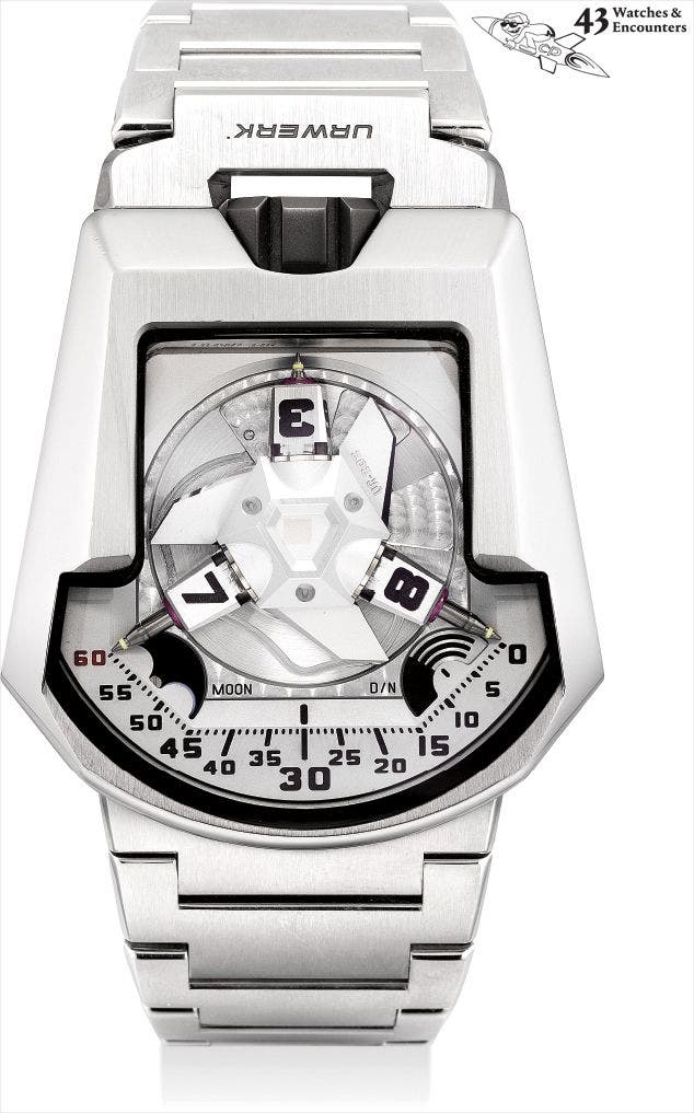 Laurent Picciotto Collection: A very rare, large and unusual stainless steel and titanium special edition three-dimensional satellite hour display, telescopic minute hand, twin turbin winding system, moon phases, day and night indicator, large poster, sketch of UR-202 and framed photograph of front and back of the watch, numbered 1 of a limited edition of 12 pieces