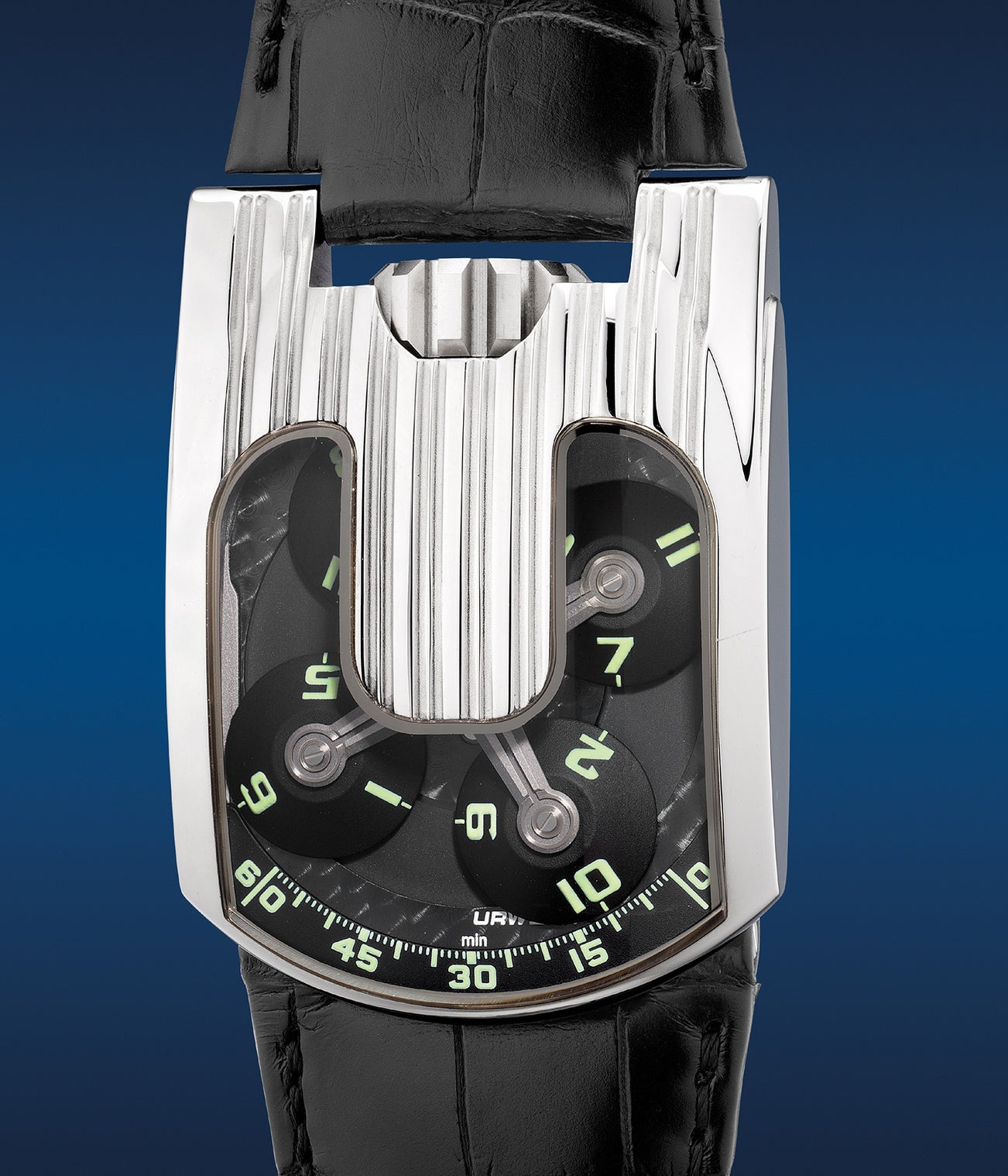 The UR-103 was in production until 2010 and was made in a range of metals and styles, the present example sculpted in white gold is preserved in an attractive futuristic appeal with its sinuous form. Designed with coherent details throughout, the bright green glow of luminous material against the matte black dial enables maximum legibility, hugging wearer’s wrist with extreme comfort and style with its curved case shape. More than a horological sculpture, the UR-103 is an icon of 21st century watchmaking and a must have in a collection of independent creators.