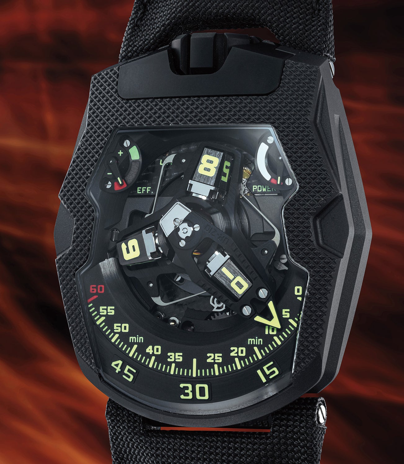 Released in 2012, the Urwerk reference UR-210 featured the innovative “Winding Efficiency Indicator”, a technical advancement indicating the amount of power added to the mainspring as the rotor moved.