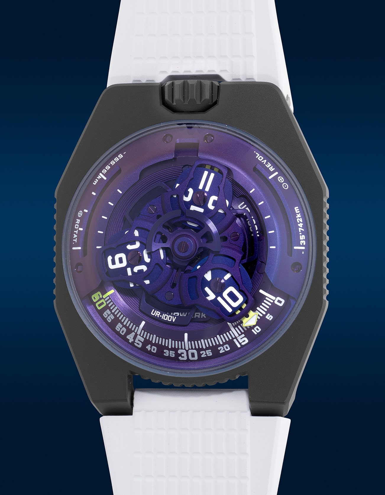 - In the autumn of 2019, Urwerk introduced the first UR-100, a timepiece that struck a balance between visual intricacy and what many consider to be the brand's most wearable case design to date. However, towards the end of 2022, an intriguing variant UR-100V UltraViolet was unveiled, featuring an enchanting royal purple hue that immediately captivates the eye with its mystical appeal.