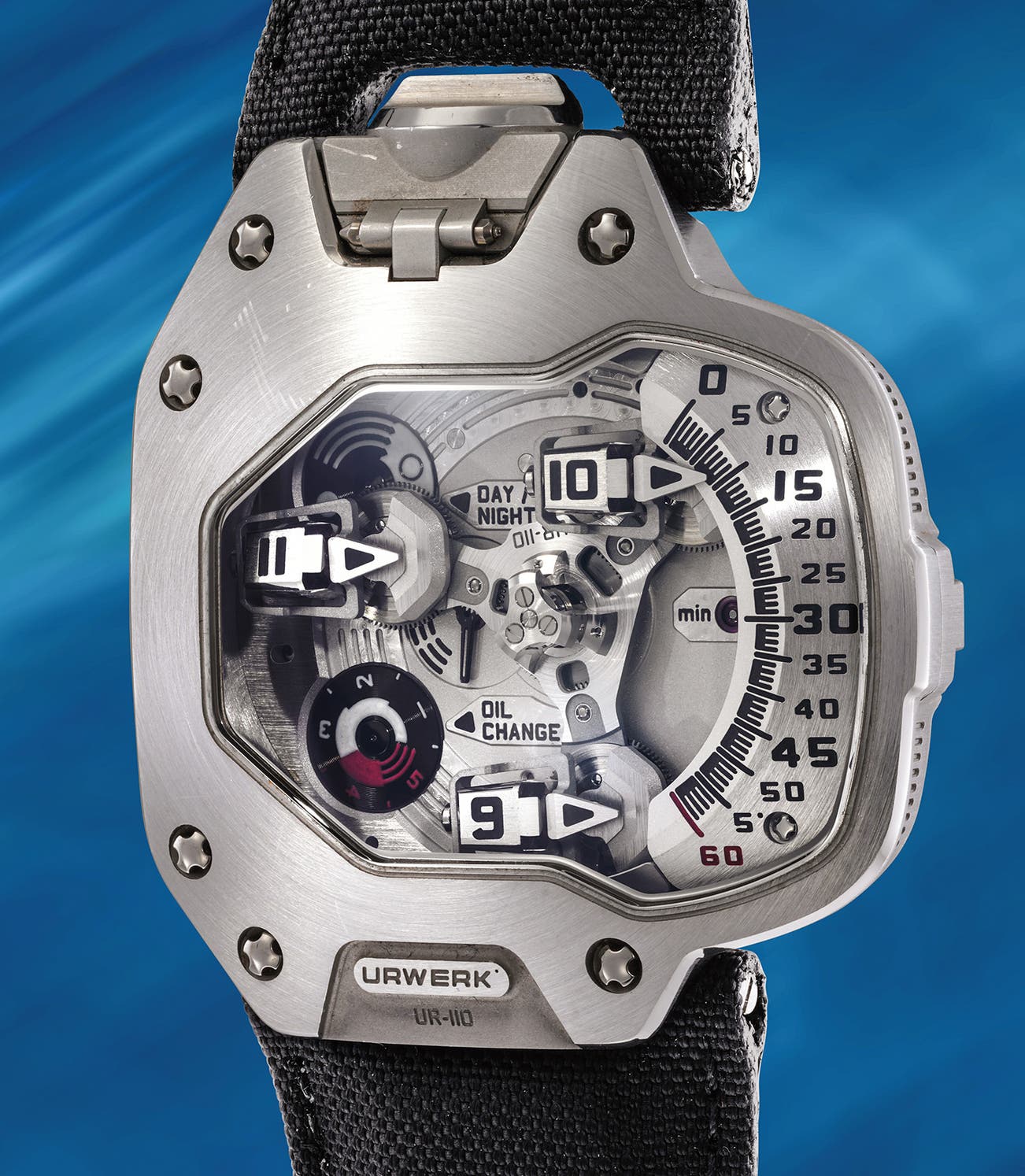 A very rare and unusual limited edition titanium wristwatch with satellite time display, day and night indication, oil change indication, guarantee and fitted presentation box, numbered 16 of a limited edition of 55 pieces