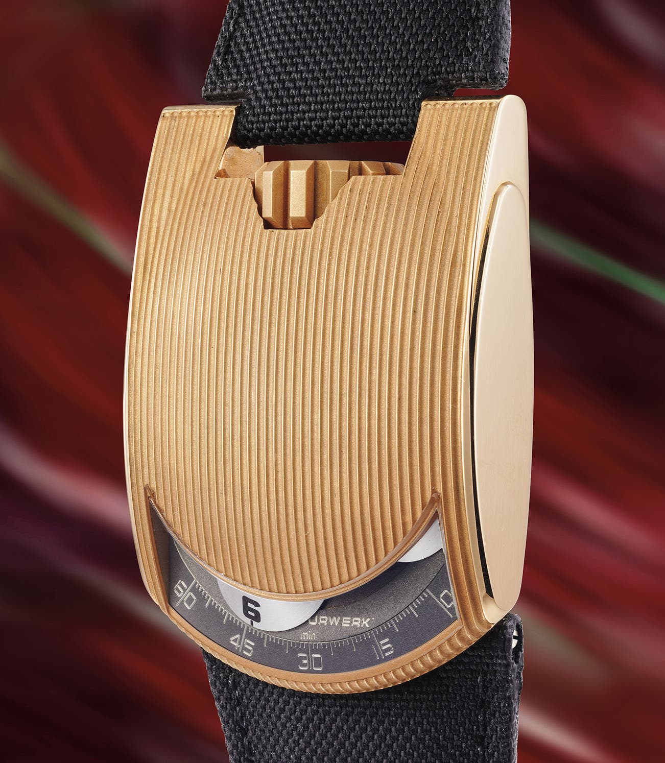 The design is a blend of industrial character and sculptural geometry. Its bombé, rectangular case features engraved lines across the top, giving it a distinctly mechanical aesthetic. Time is read through a window at the base, where Urwerk’s signature rotating satellite discs display the hours as they sweep across a minute track—an ingenious and instantly legible system that redefined how a watch could communicate time.