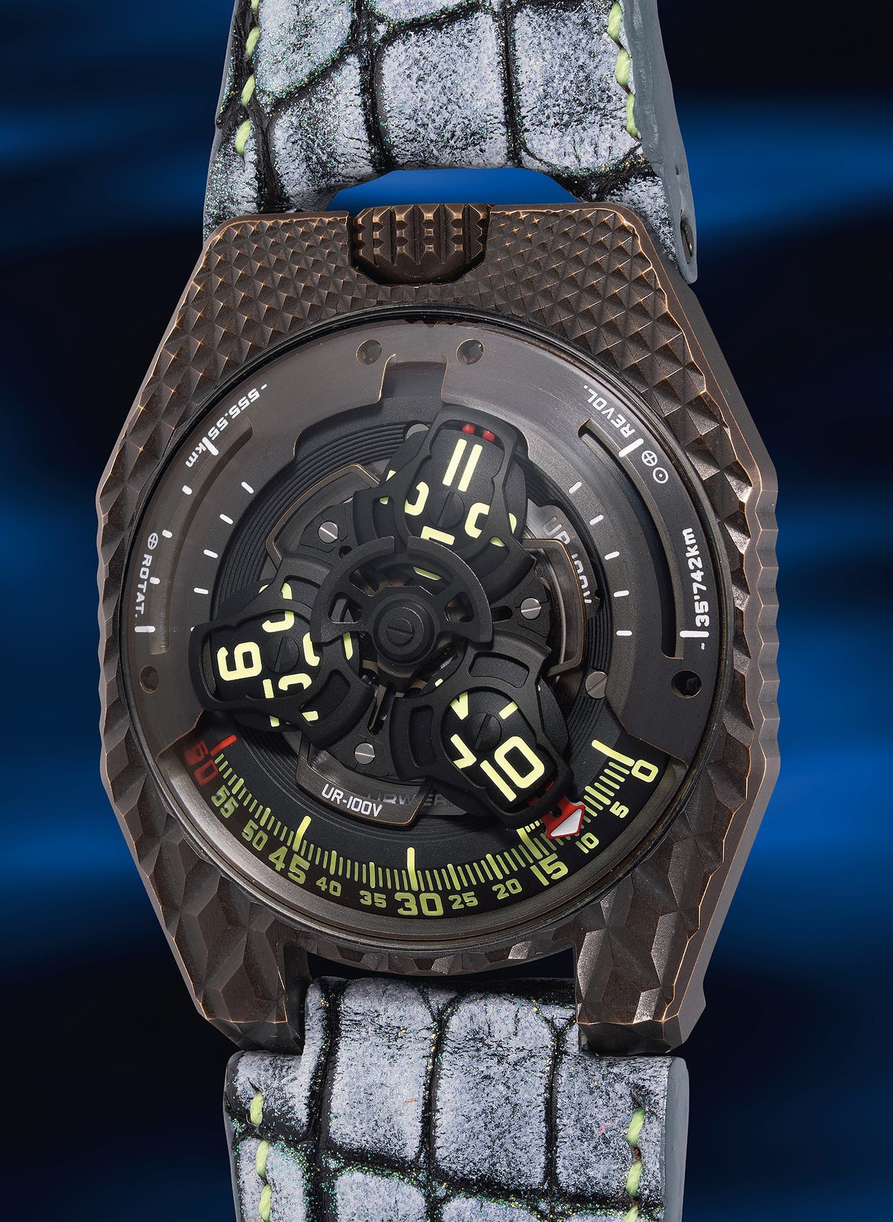 The UR-100V T-Rex is a strikingly unconventional timepiece that merges futuristic horology with prehistoric inspiration. Its case is crafted from bronze and features a distinctive hobnail pattern that mimics the texture of reptilian scales, which explains the “T-Rex” moniker. This pattern is achieved through a meticulous process of milling, sandblasting, and chemical treatment, resulting in a rich, aged patina that gives the watch a primal, almost fossil-like appearance. Despite its rugged aesthetic, the watch is surprisingly compact and wearable, measuring 41mm in diameter and sitting comfortably on the wrist thanks to its curved caseback.